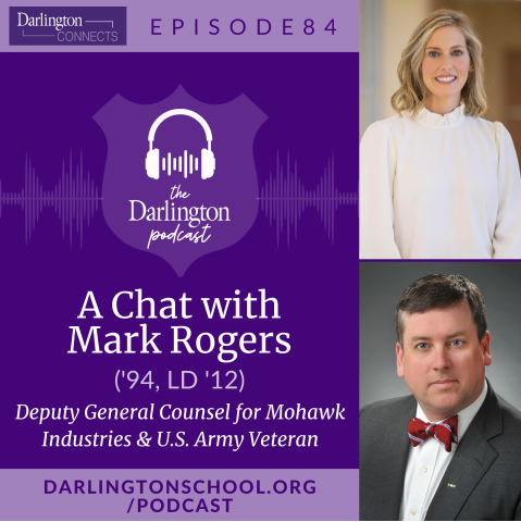 In this episode, Cassidy Carter, director of development in the Advancement Office, talks with Mark Rogers ('94, LD '12), deputy general counsel at Mohawk Industries. They chat about Rogers' career, from serving the military to practicing law. He offers career and life advice that he shared with Darlington students at Career Day 2022, and talks about how his Darlington experience shaped his path as an adult.