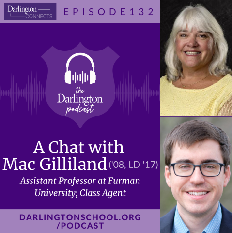In this episode, Director of Alumni Relations Vicki Vincent chats with Mac Gilliland ('08, LD '17), assistant professor of chemistry at Furman University. He shares about his experience as a boarding student at Darlington, his recent 15-year class reunion at Alumni Weekend and his career journey.