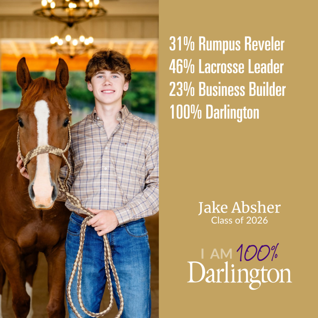 Find out how you can be 100% Darlington, too, by requesting a personal campus tour at www.darlingtonschool.org/visit or contacting admission@darlingtonschool.org.