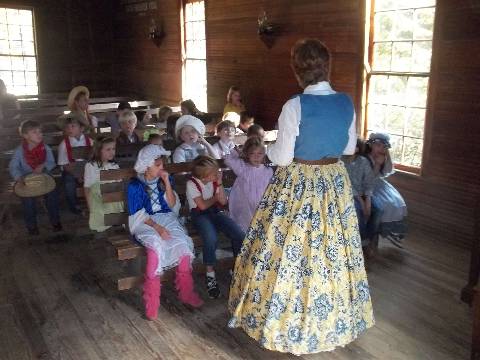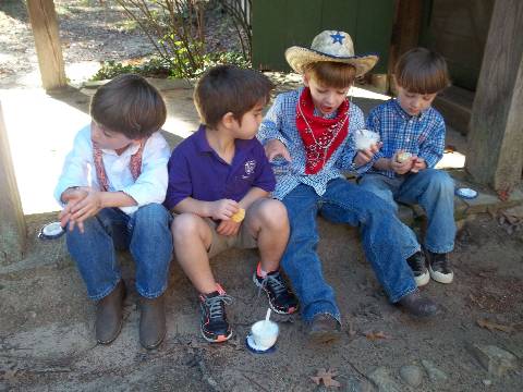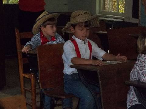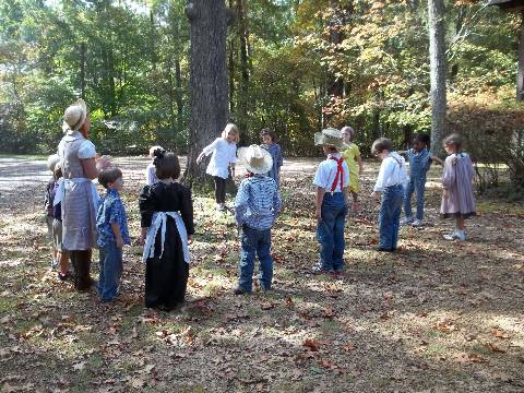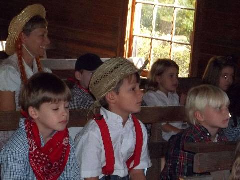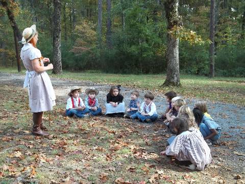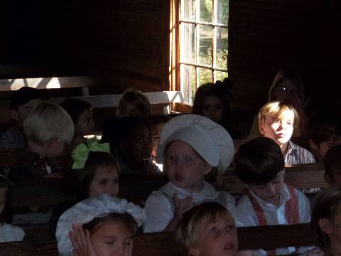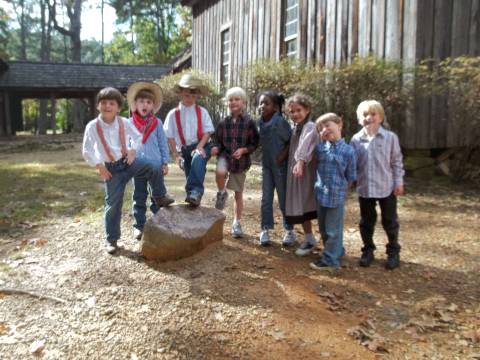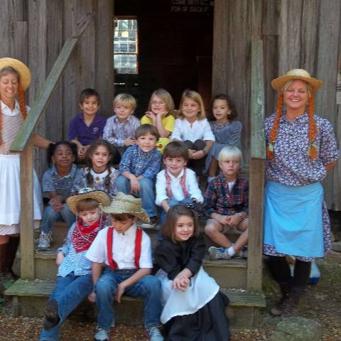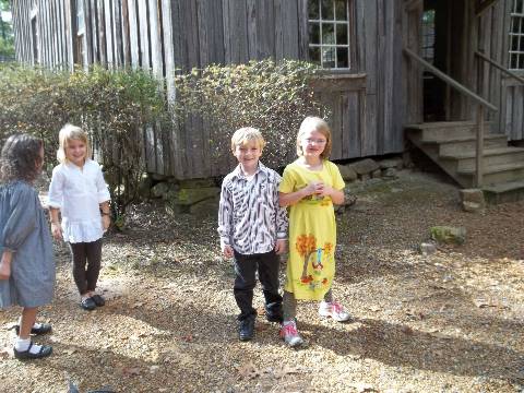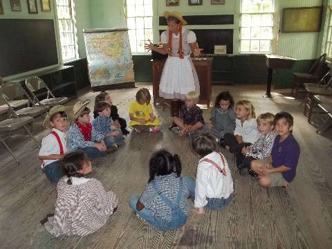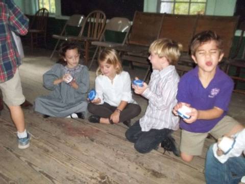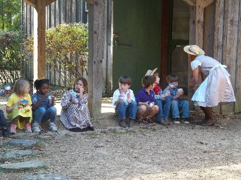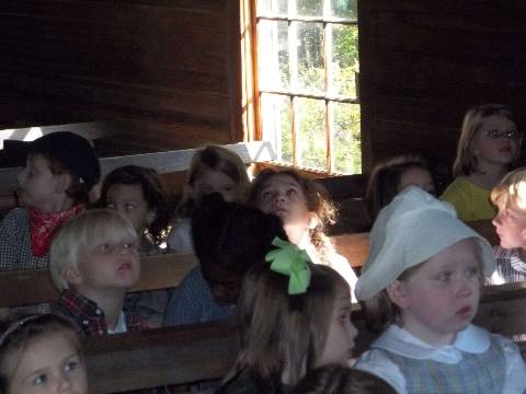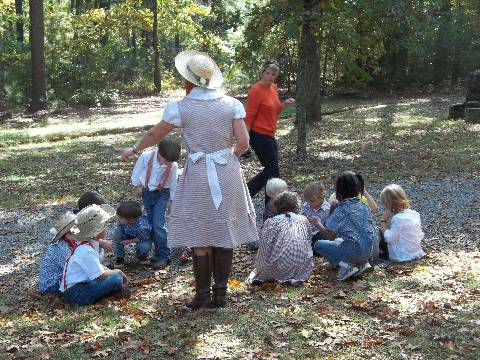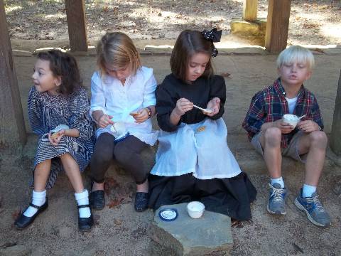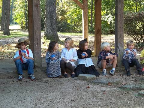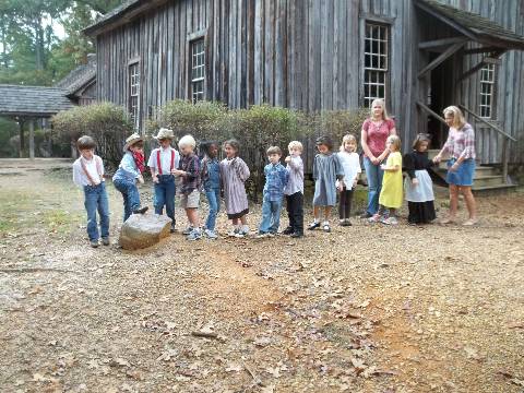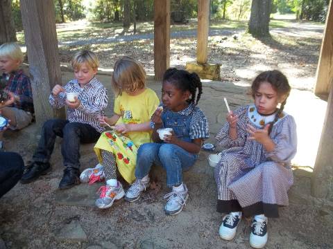 Kindergarteners experienced a day in the life of a student that went to Possum Trot School, located on Berry College's campus. They heard the school bell ring and went to the chapel, had a lesson in the one room school house, made butter from cream, played old time games and enjoyed lunch on the lawn. What a great day!