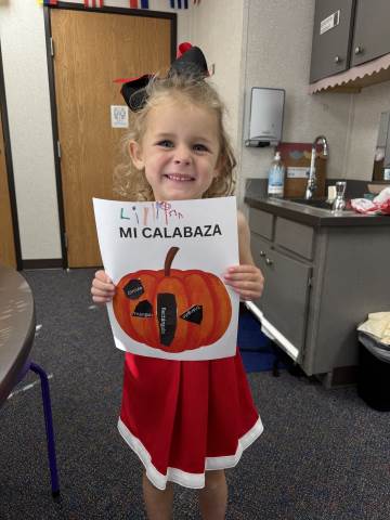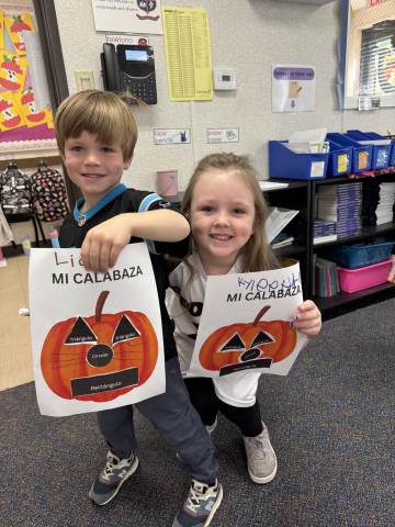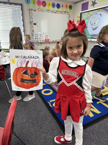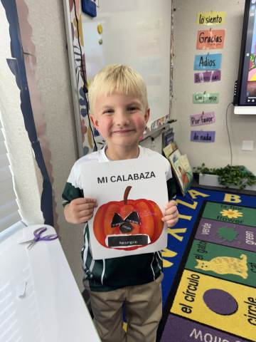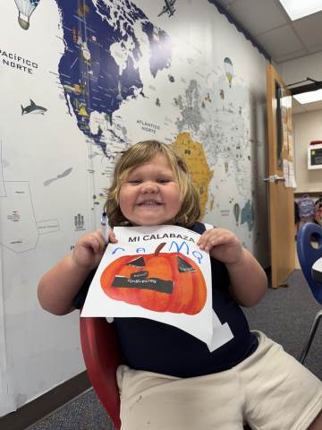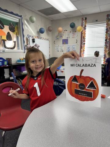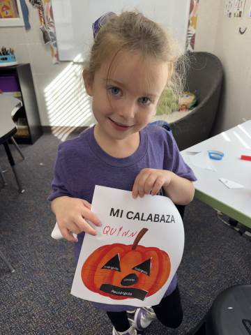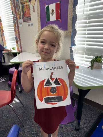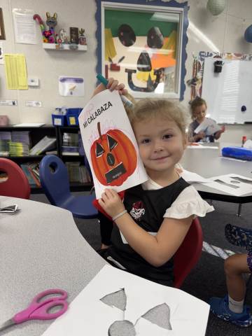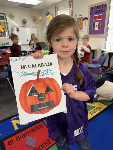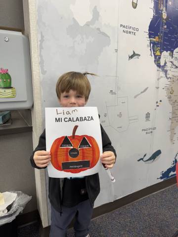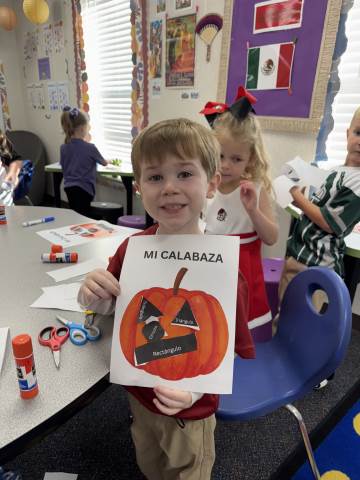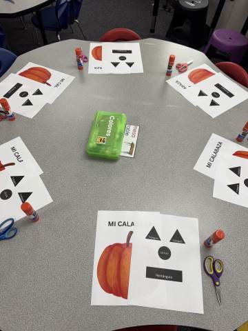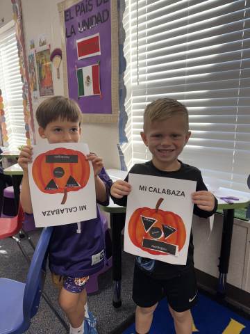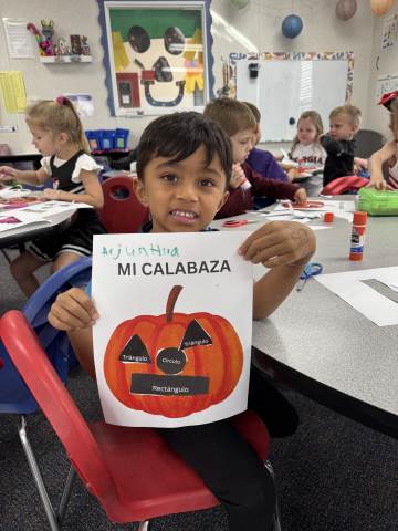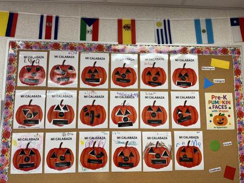 Pre-K students created pumpkin faces by using the Spanish shape words they have been learning! They practiced identifying and naming shapes in Spanish while decorating their own pumpkins with círculos, rectángulos, and triángulos.