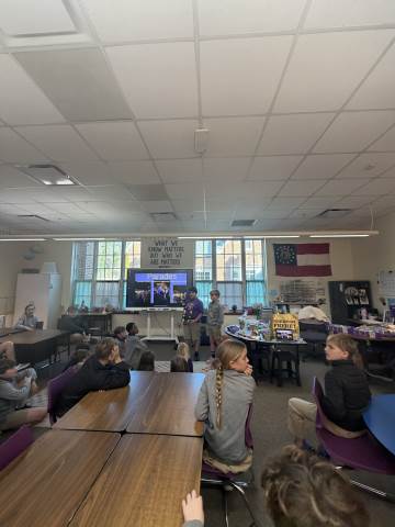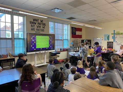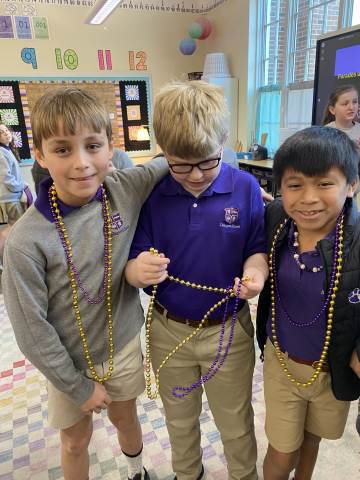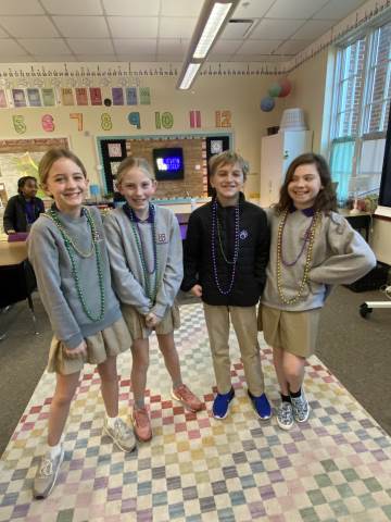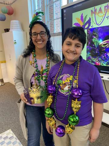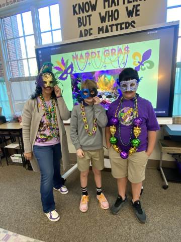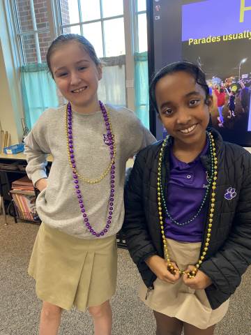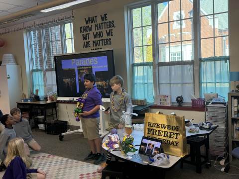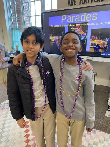 Fourth-graders Graham Harris and George Bagley, accompanied by Graham's mother, Sonbol Shahid-Salles, teach fourth grade about their recent trip to New Orleans for Mardi Gras 2026. They created a Canva presentation to share details about Carnival season, Fat Tuesday, parades, customs, etc., and then answered questions from curious peers. Students enjoyed seeing all the gear and beads that Graham and George collected from the parades, and everyone was able to try king cake and take home some real Mardi Gras beads!