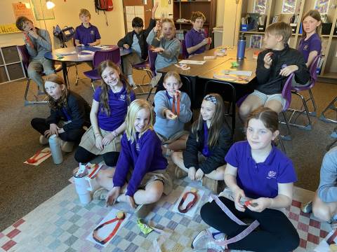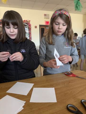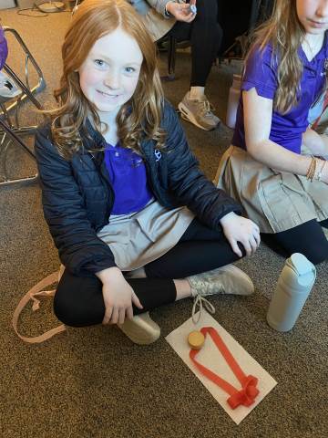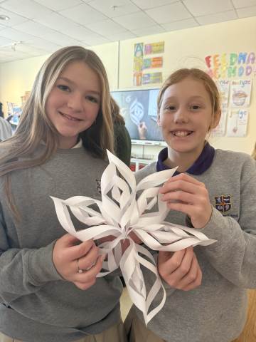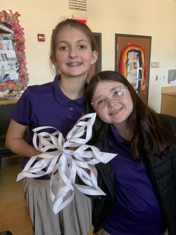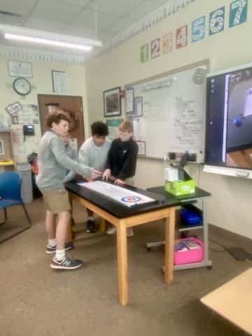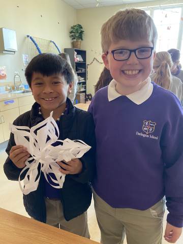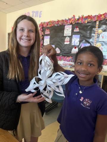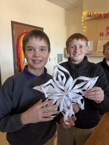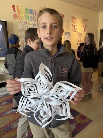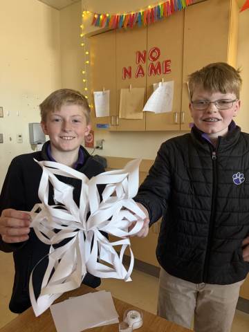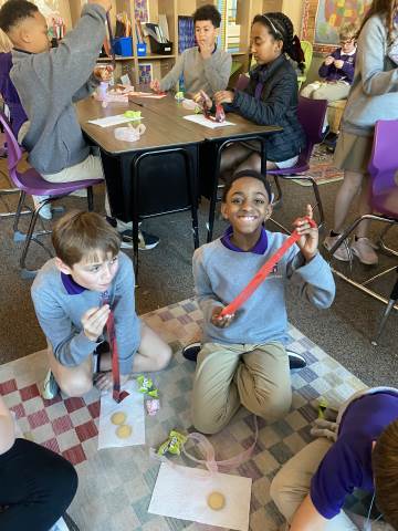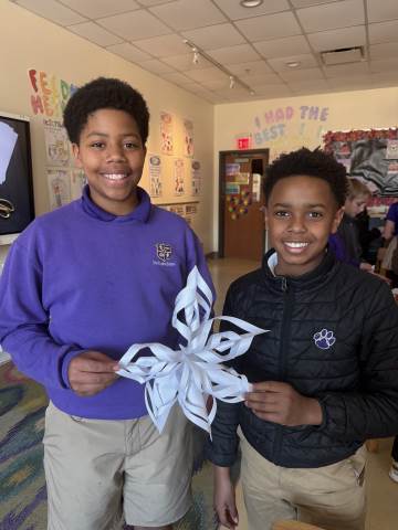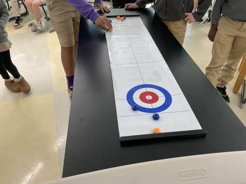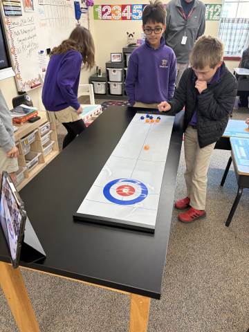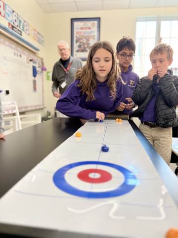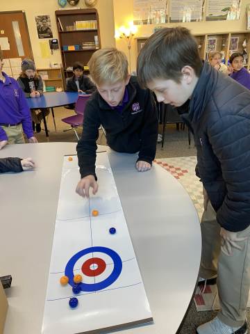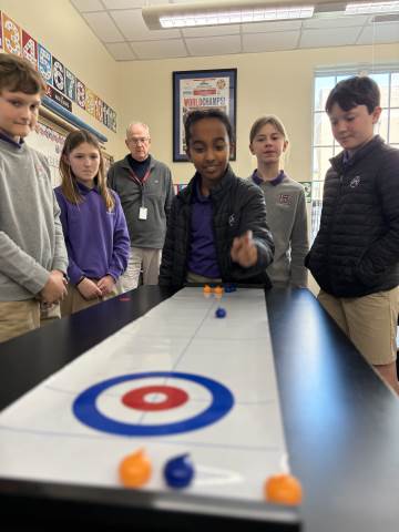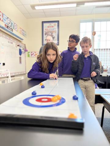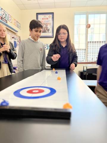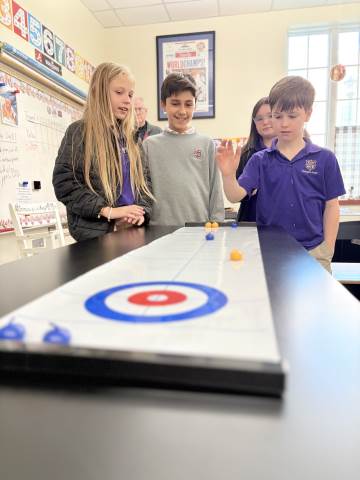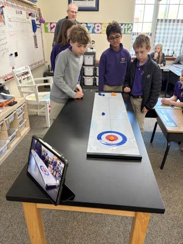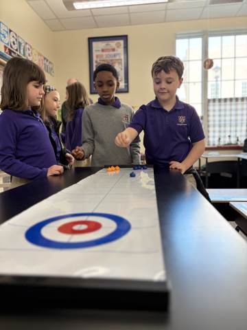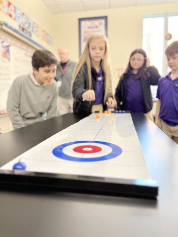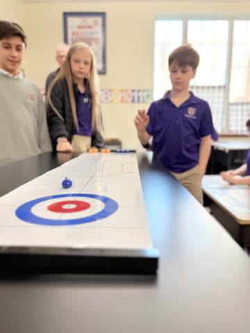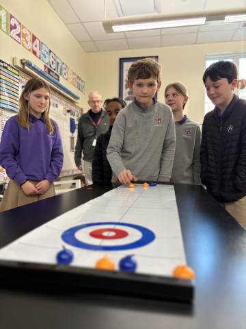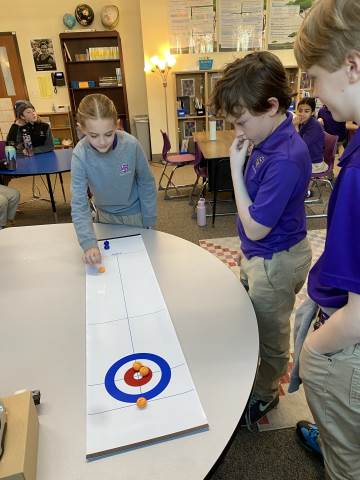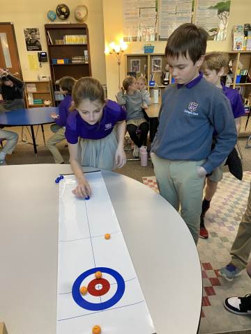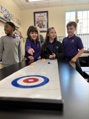 Students in grades 3-5 were treated to an Olympics-themed exploratory "snow day" by their teachers. The day began with a surprise snowball attack and then a snowball throwing competition, and included several fun, enriching themed activities. The students created unique paper snowflakes during what has become an annual winter activity. Each year, our older students help the younger students with the detailed folds, cuts and attachments. Another fun part of our snow day was the skier STEM challenge and race. The teams constructed their skiers using aluminum foil and attached craft stick skis, then raced them on an incline. An interesting part of the day was learning about curling from special guest Dr. Dixon Freeman. We even tried our hands at curling with miniature table top curling sets. Our P.E. activity was sled racing on scooters. We participated in a fun technology sled dog race as well. The day ended with Winter Olympics trivia and a sweet "gold medal" snack.