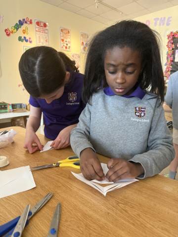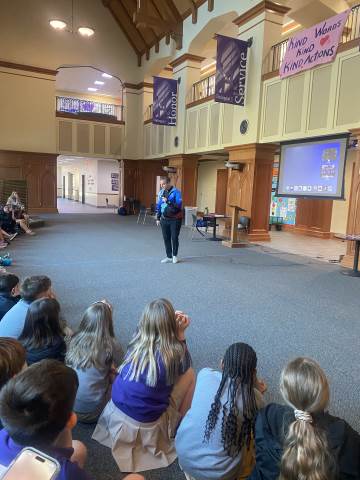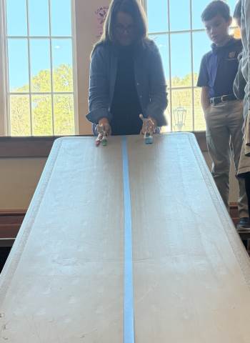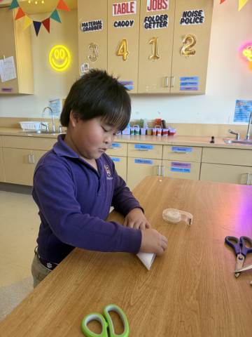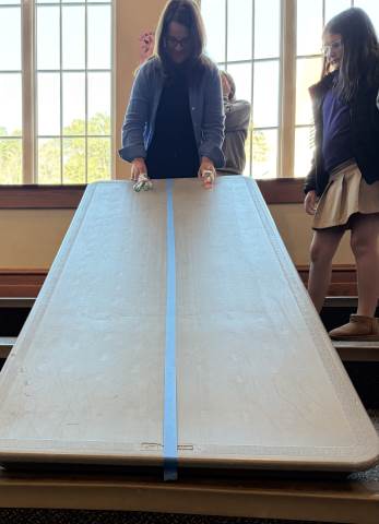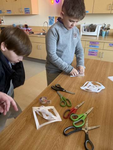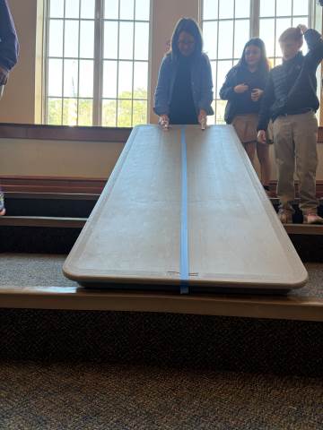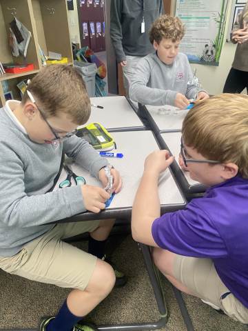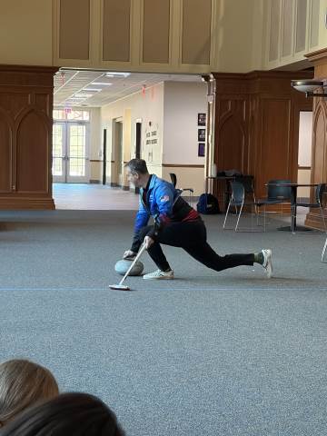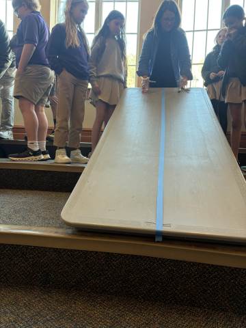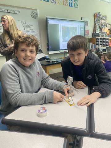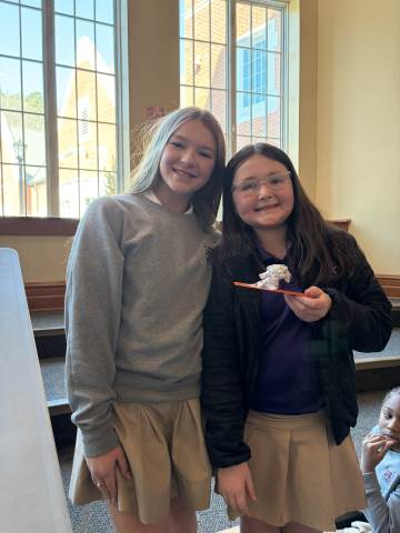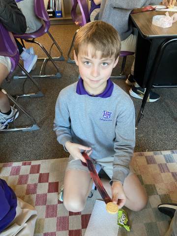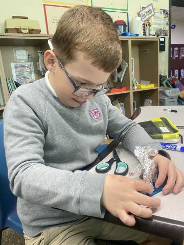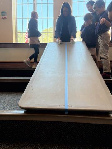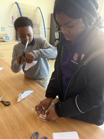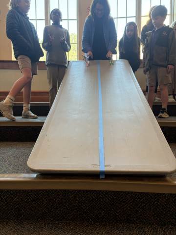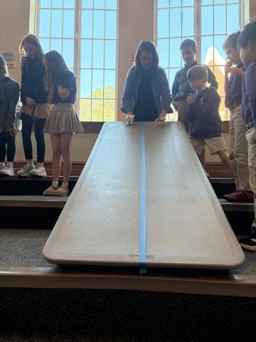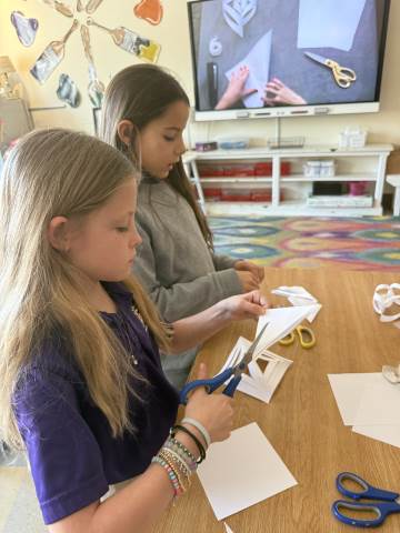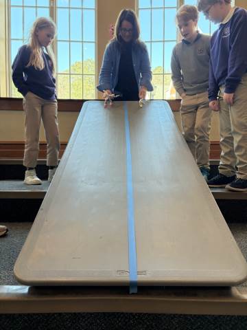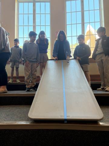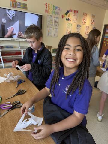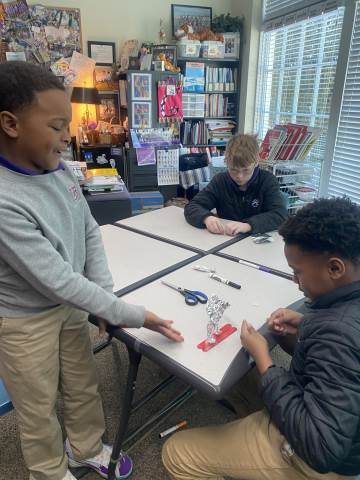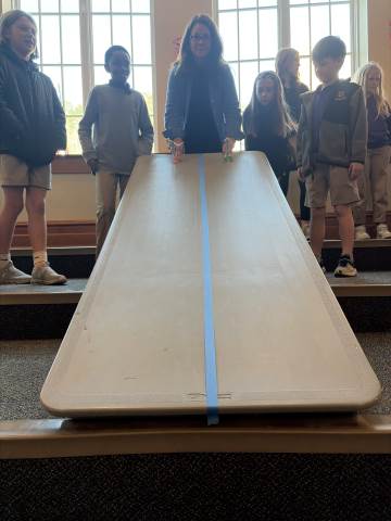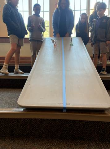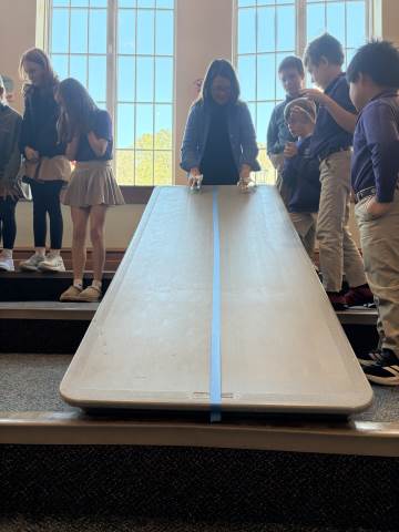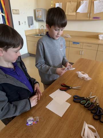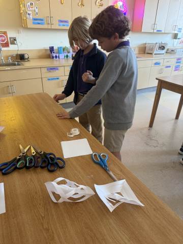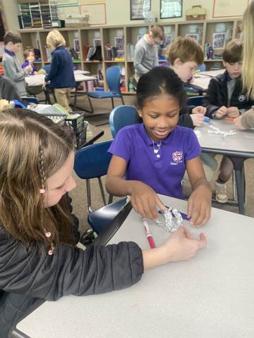 Students in grades 3-5 were treated to an Olympics-themed exploratory "snow day" by their teachers. The day began with a surprise snowball attack and then a snowball throwing competition, and included several fun, enriching themed activities. The students created unique paper snowflakes during what has become an annual winter activity. Each year, our older students help the younger students with the detailed folds, cuts and attachments. Another fun part of our snow day was the skier STEM challenge and race. The teams constructed their skiers using aluminum foil and attached craft stick skis, then raced them on an incline. An interesting part of the day was learning about curling from special guest Dr. Dixon Freeman. We even tried our hands at curling with miniature table top curling sets. Our P.E. activity was sled racing on scooters. We participated in a fun technology sled dog race as well. The day ended with Winter Olympics trivia and a sweet "gold medal" snack.
