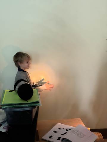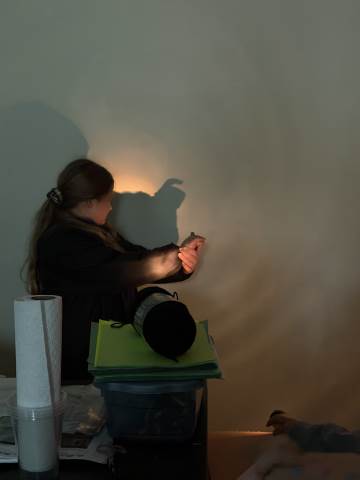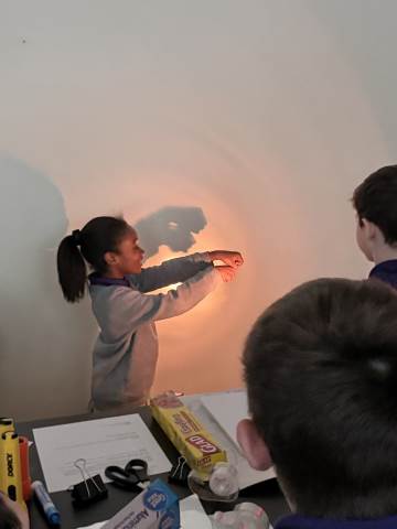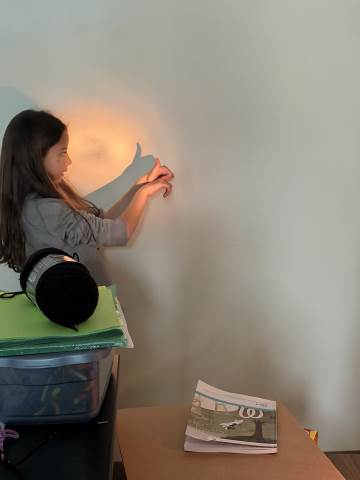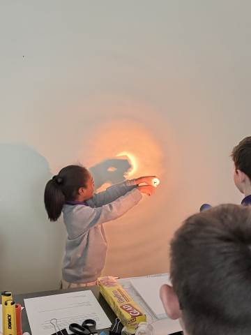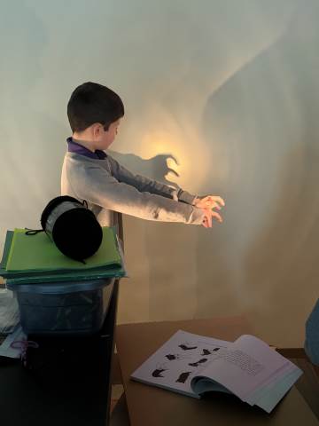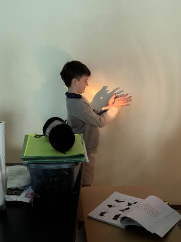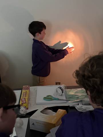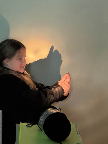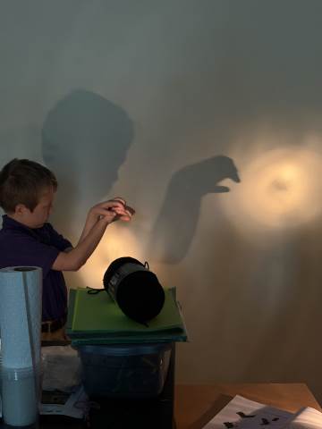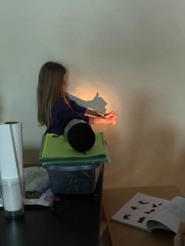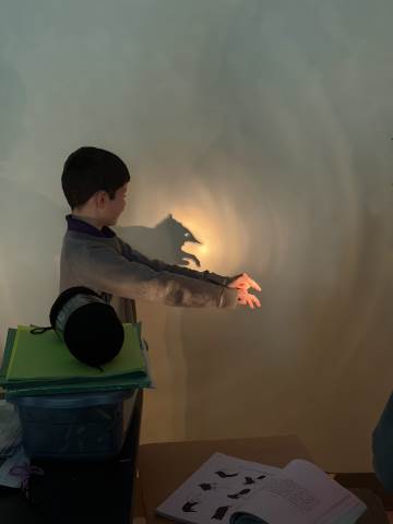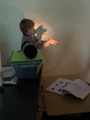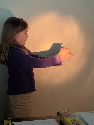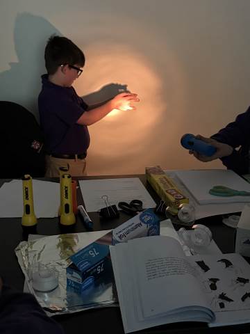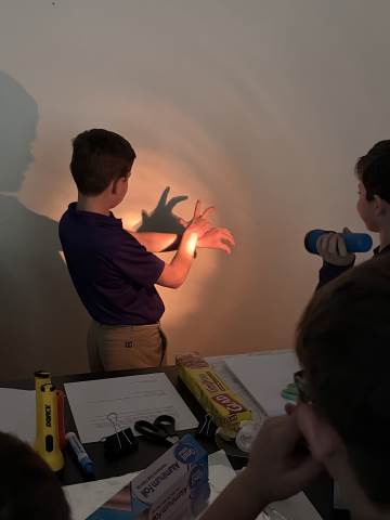 In a continuation of their study of light energy in literacy, third-graders discovered how blocked light can impact the size and shape of shadows. The students used flashlights and discovered the proximity of the light determined how big or small the shadow could be. Creating hand puppets was fun. too!