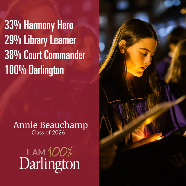 A Darlington student is made up of many things. None of which is average. We help our students develop their interests, passions and pursuits, because we believe every individual has something to contribute. We also believe that only when you're 100% you, are you 100% Darlington.