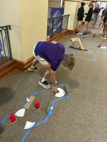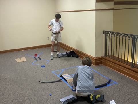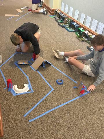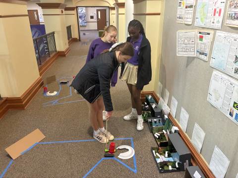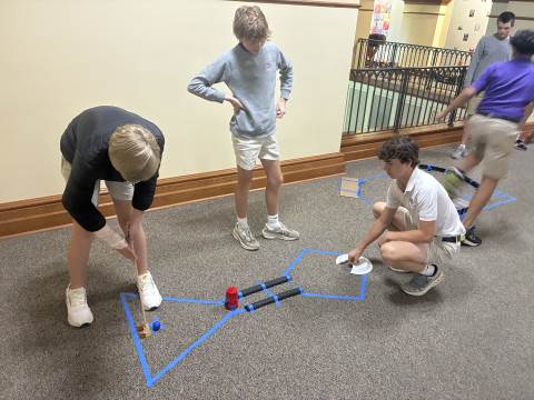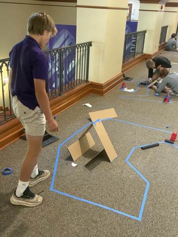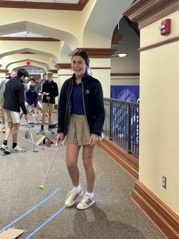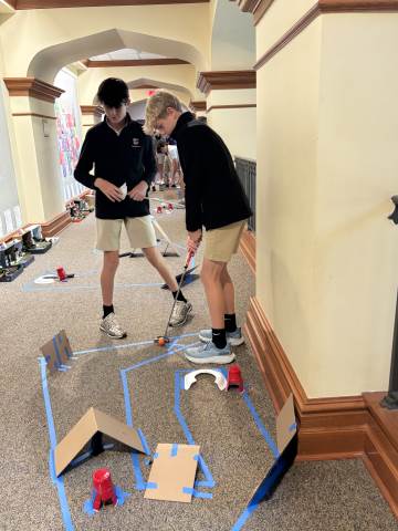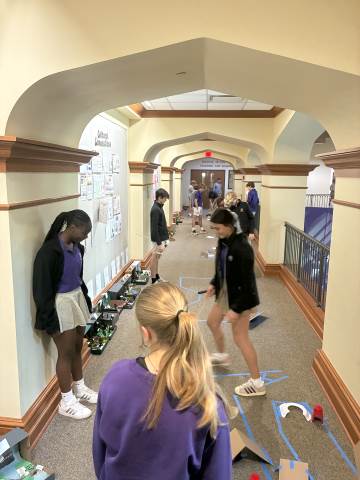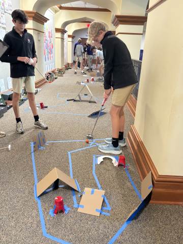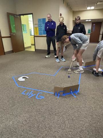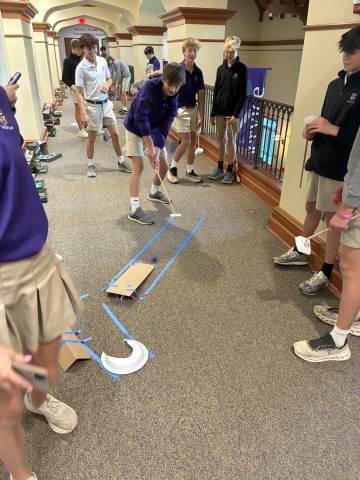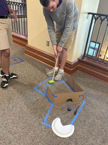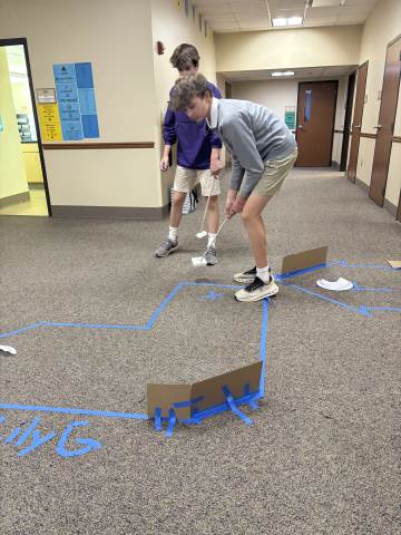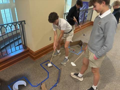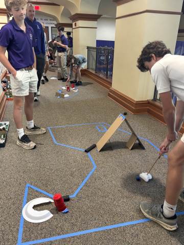 Students in Mr. Eberhart’s eighth-grade Algebra 1 Honors class utilized their piecewise function skills to design miniature golf courses. Initially, they created their courses using a graphing program. Subsequently, they had the opportunity to construct and play with their courses alongside their peers.