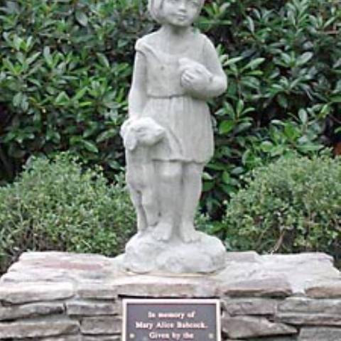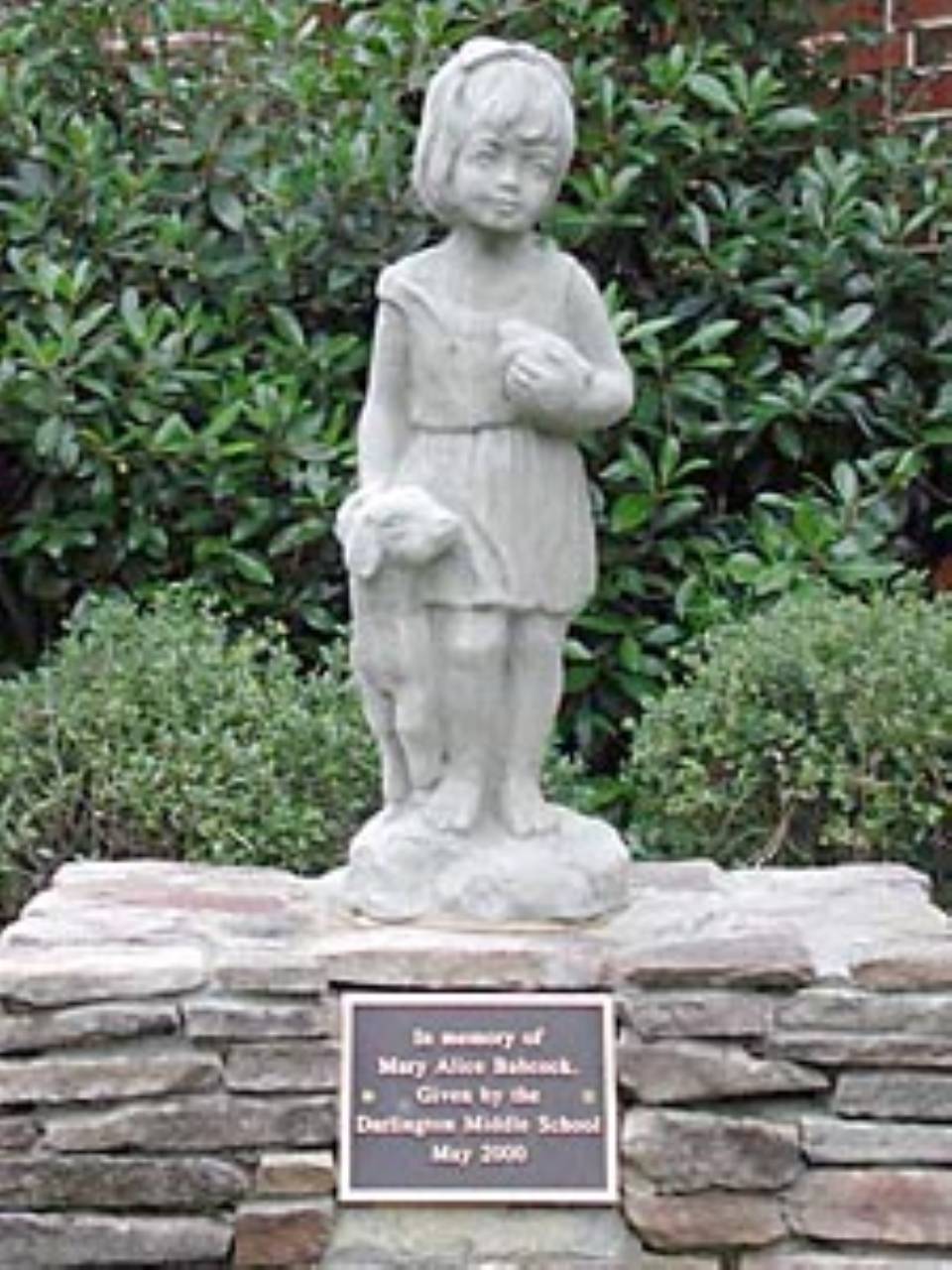 A memorial plaque attached to the statue’s pedestal reads, "In memory of Mary Alice Babcock, given by the Darlington Middle School, May 2000."