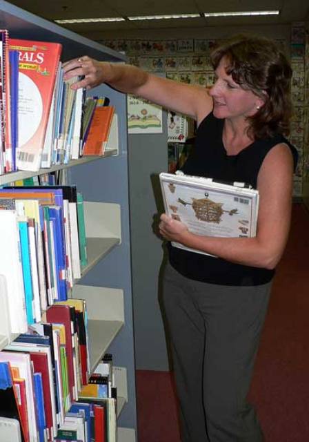 Lynda Miller organizes books at Sara Hightower Regional Library. Photo by Kaitlin Beard, RN-T