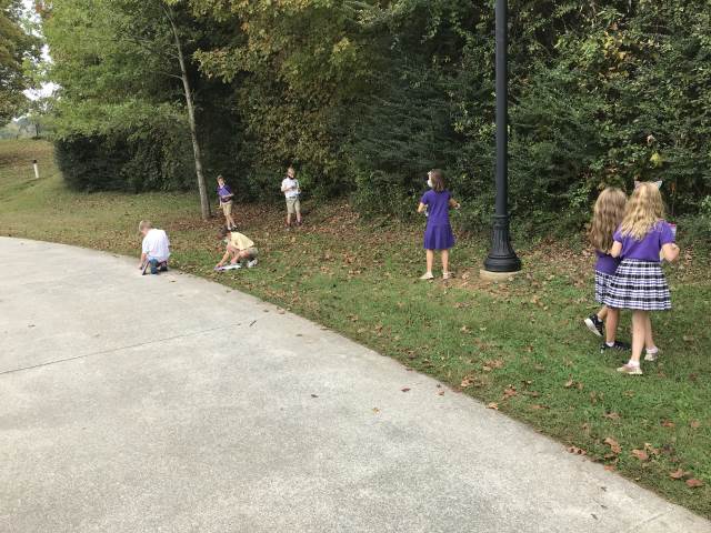 Third-graders are studying the process of photosynthesis in science and Mr. Beckman joined us from the middle school this afternoon to discuss that process in more detail. He took us on a leaf hunt to find alive and dead leaves that we will study under the microscopes in our science lab. We will be looking for chloroplasts to see where the process takes place. The students made a hypothesis about what we will find, or not find, in the leaves!