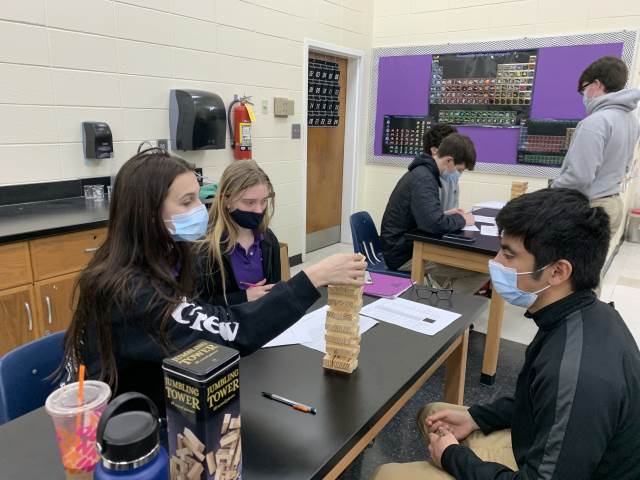 Upper School chemistry students pulled blocks labeled with ionic compounds and used them to predict the products of chemical reactions. This provided a review of past concepts that are embedded in the next topic of stoichiometry.