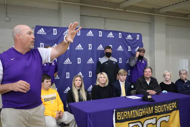 Surrounded by family, friends, coaches and classmates, Thomas Speed signed to play football at Birmingham Southern College during a ceremony on Friday, April 23 in the Johnson Field House in the Huffman Center.