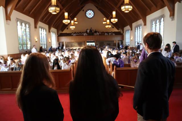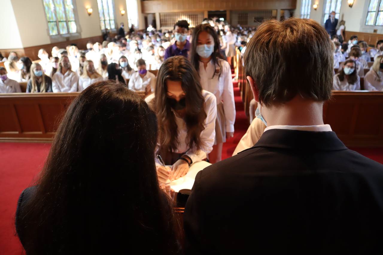New Upper School students and faculty pledge to live by Darlington's Honor Code with the signing of the Honor Book in Morris Chapel.