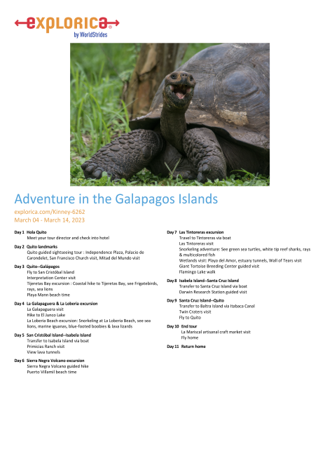 Darlington students, families, friends and alumni are invited to spend spring break in the Galápagos Islands and Quito, Ecuador with Science Department Chair Owen Kinney. The 11-day trip will depart March 4 and return March 14, 2023.