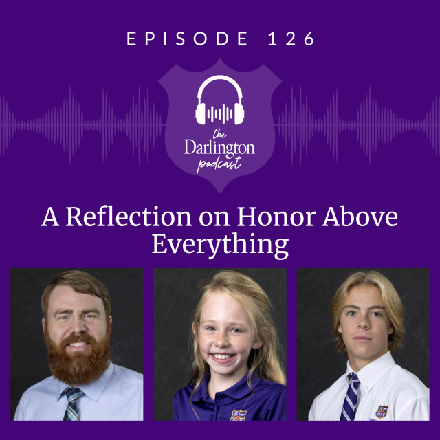 In this episode, Upper School Learning Specialist and faculty advisor to the Honor Council Justin Bruce talks with fifth-grader Adelyn Fine and senior Maddox Andrews, who serves as president of the Honor Council. They talk about the history and role of the Honor Council and reflect on how Darlington students display Honor Above Everything. Watch a recording of Darlington's 119th Opening Convocation here, featuring speeches about honor from Adelyn and Maddox.