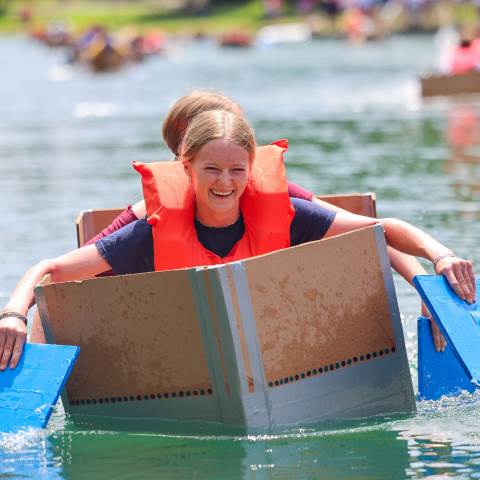 Teams of 3-4 physics students put their physics knowledge to the test and built cardboard boats made of only two 4 ft x 8 ft sheets of cardboard (donated by Dalton Box - A TRG Company) and 60 yards of duct tape.  Two members from each team paddled their way across Silver Lake at Darlington.  Of the 30 teams competing, 13 teams made it completely across the lake.