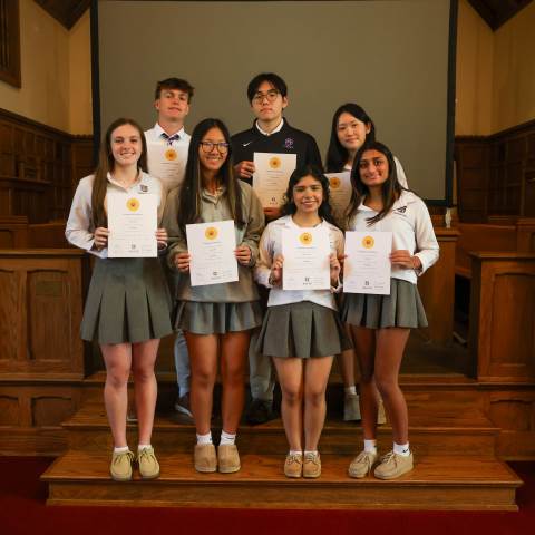 To be inducted into Sociedad Honoraria Hispánica, students must have completed three semesters of Upper School Spanish; currently have an average of 90 or higher if enrolled in AP Spanish/Spanish III Honors/Spanish II Honors, or an average of 93 or higher if enrolled in Spanish IV/Spanish III /Spanish II the semester of selection; and have maintained an overall average of 90 or higher in all Spanish courses. Inductees are selected by a committee of language teachers based on their current teacher's evaluation and the student's current and future language experiences.