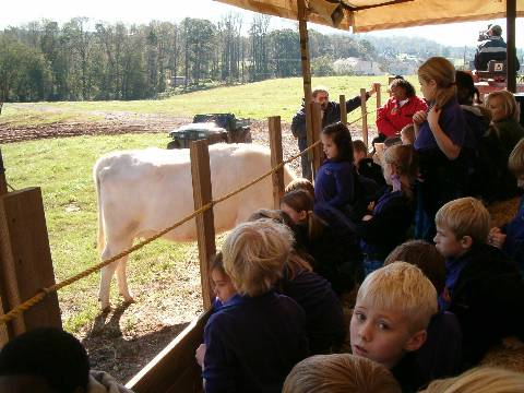 We boarded buses and headed to Canton. Once at the dairy we had a tour of the processing plant, went on a hayride around the far, watched Jake (an Australian Shepherd)herd the cows, fed young calves, sample the milk, had a picnic and last BUT not least -- the Corn Maze!