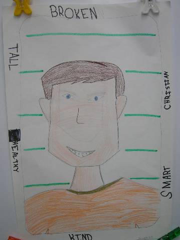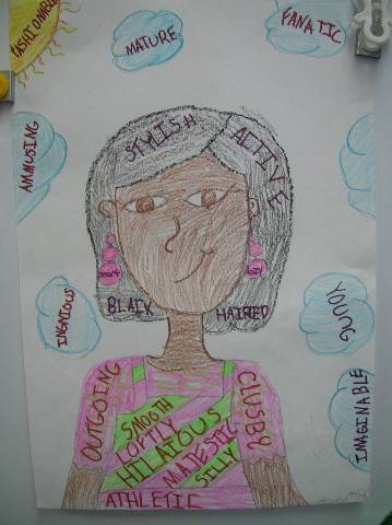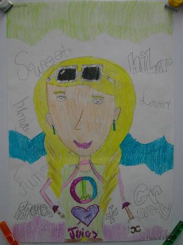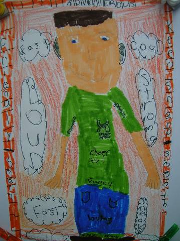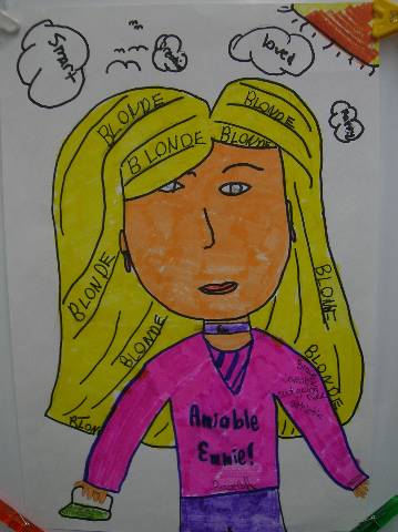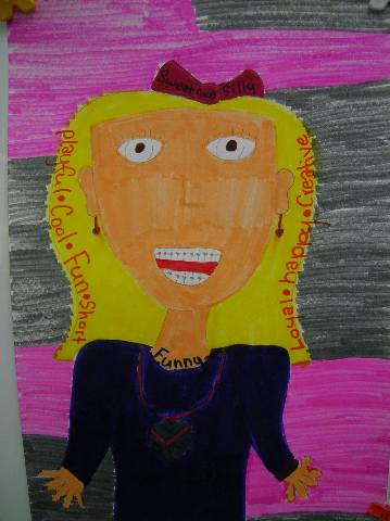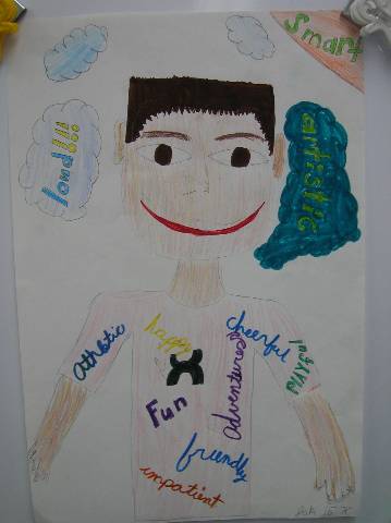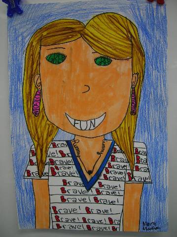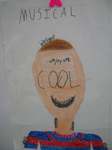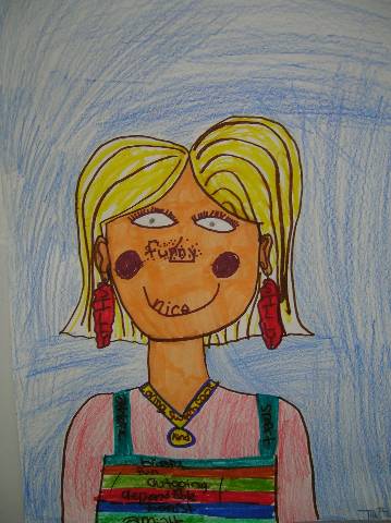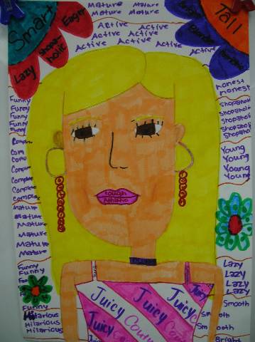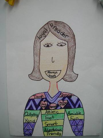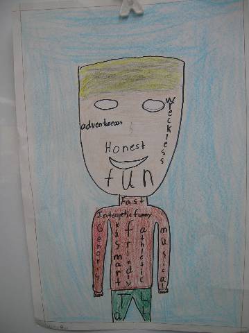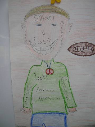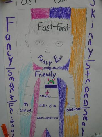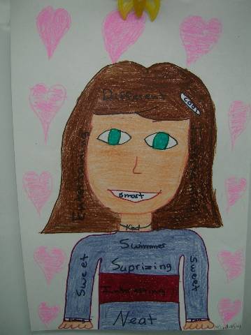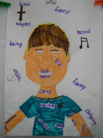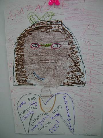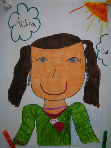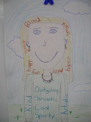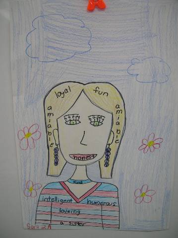 Fourth-grade students chose adjectives to describe themselves and included them in their self-portraits.