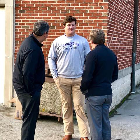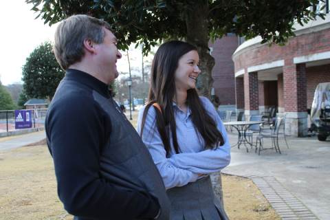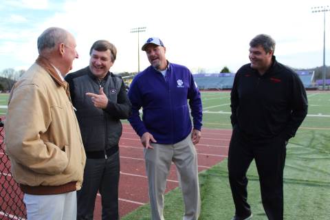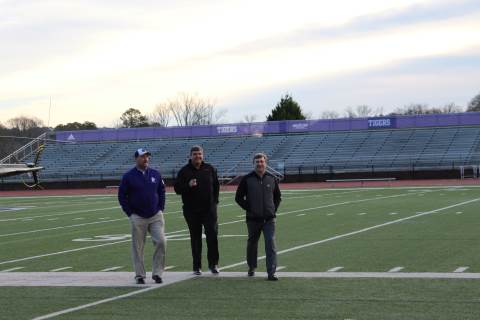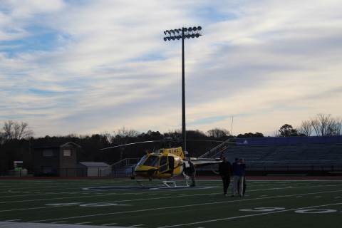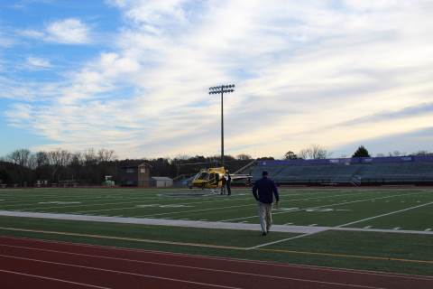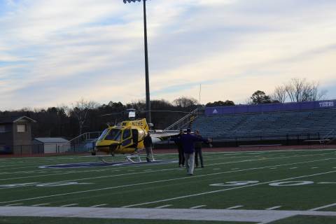 Landing a helicopter on the 50-yard line of Chris Hunter Stadium provided a spectacular entrance for University of Georgia Head Football Coach Kirby Smart and new UGA offensive line coach Matt Luke.