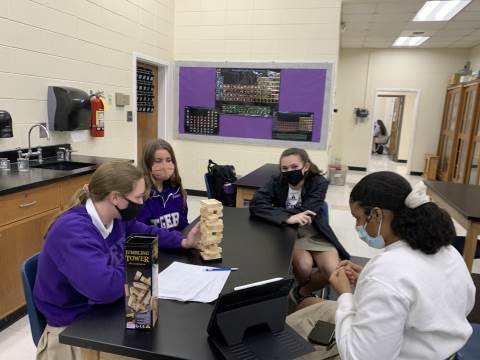 Upper School chemistry students pulled blocks labeled with ionic compounds and used them to predict the products of chemical reactions. This provided a review of past concepts that are embedded in the next topic of stoichiometry.
