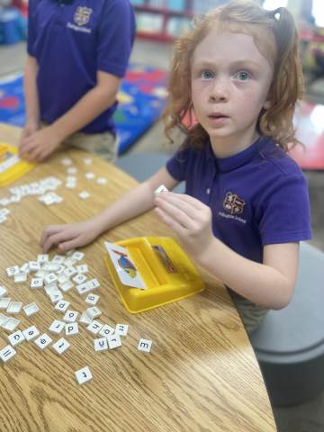 During Spanish class, first-graders learned new vocabulary by putting the letter tiles on the tray and match them with the Spanish flash cards. This game also helps students develop their concentration and memory skills. They had so much fun!