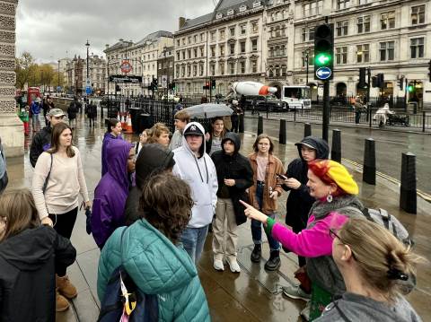 Twenty-three students and five faculty have ventured to England for Thanksgiving Break. The first two days were packed with fun like tea at the British Museum, exploration of Westminster Abbey, views from the London Eye, and plenty of guided walking tours of London to see sites like Trafalgar Square, Parliament, Big Ben, St. Paul’s Cathedral, Downing Street, and The Globe Theatre. And for a bonus, we waved to King Charles III as he left Buckingham Palace!