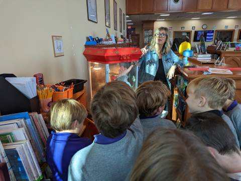 Students read "The Popcorn Book" and enjoy fresh popcorn with Mrs. Brock.