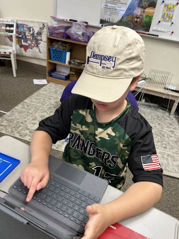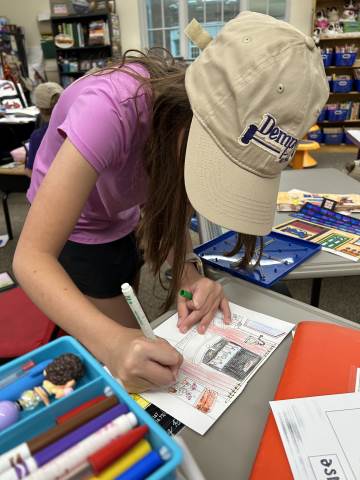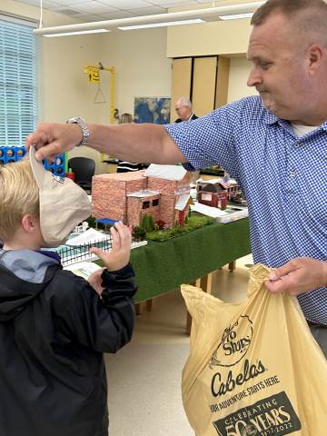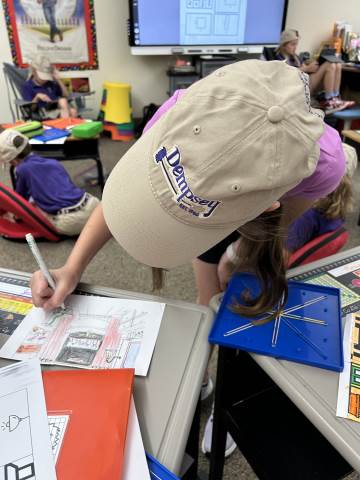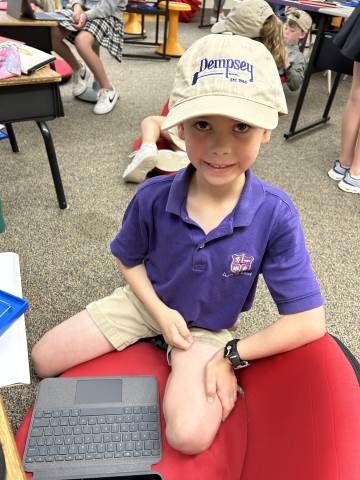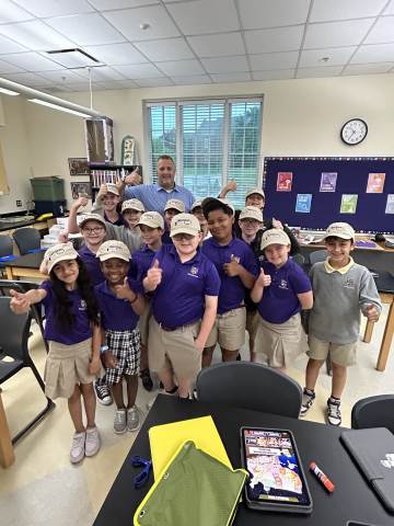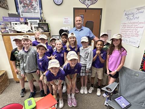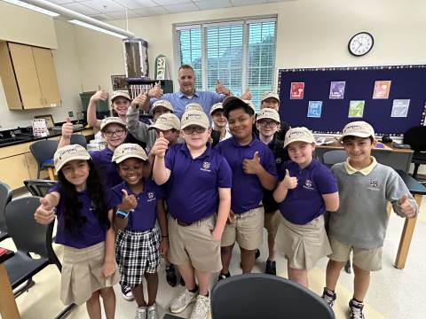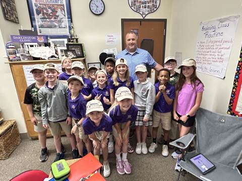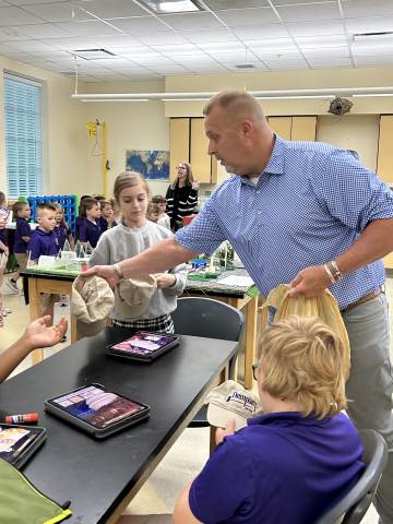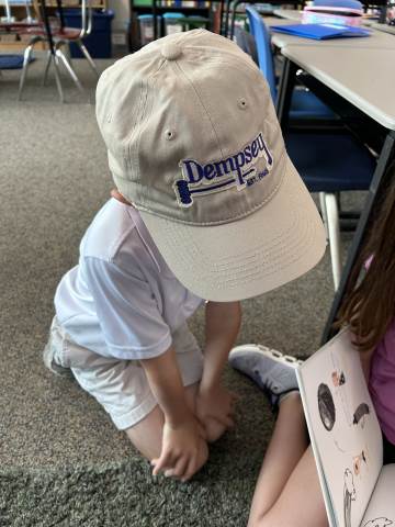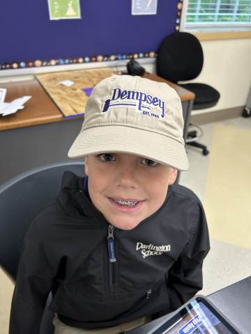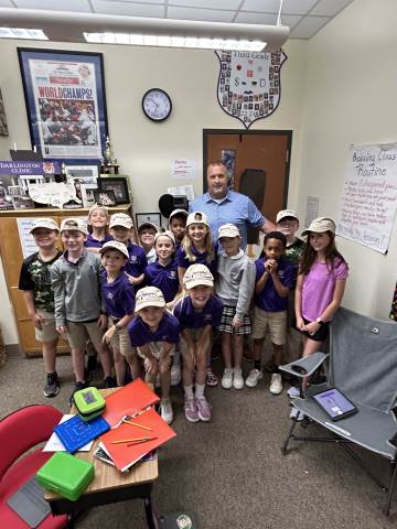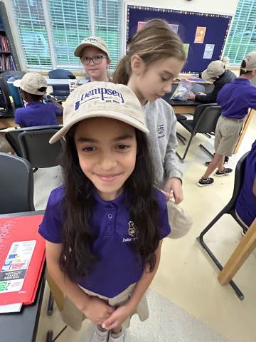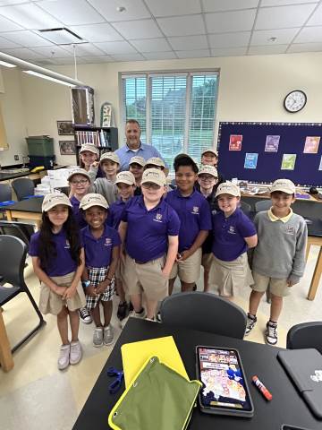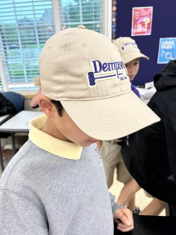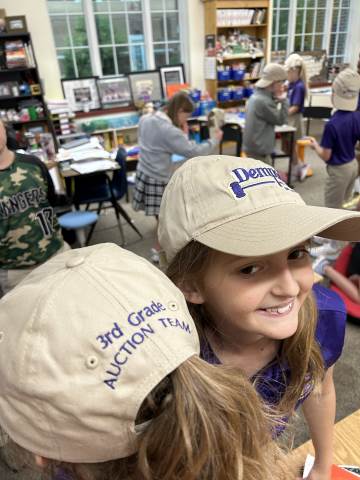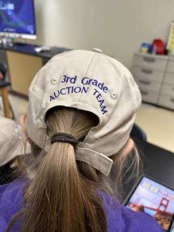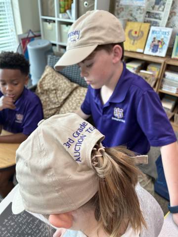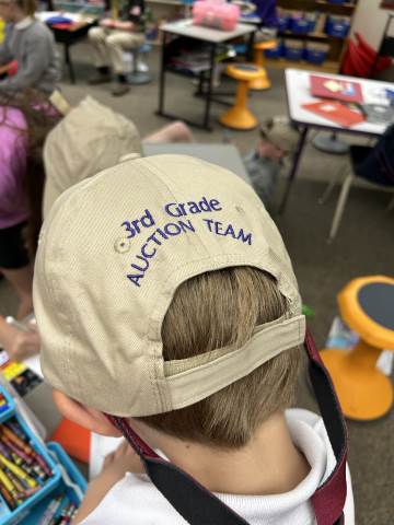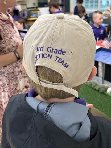 Our community project partner, Lou Dempsey ('87, LD '17) with Dempsey Auction Co., surprised third graders with auction team caps.