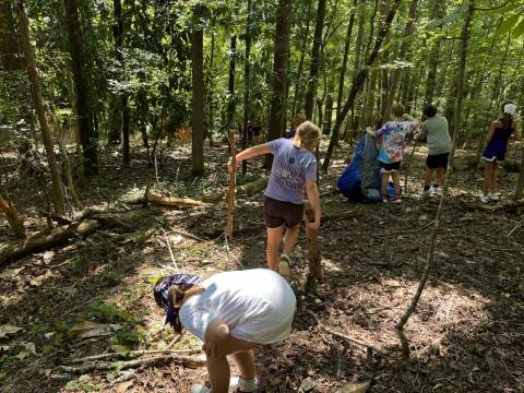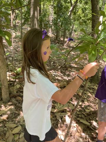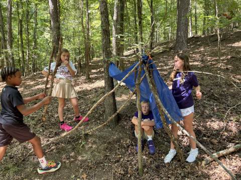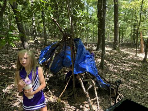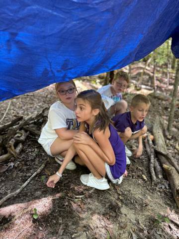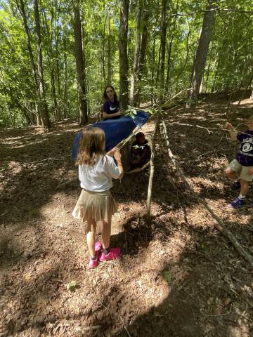 Over the summer, fourth-graders read the book "The Wild Robot" by Peter Brown. Their teacher, Dr. Natarella, surprised students today by acting like a survivor stranded on an island. Once organized, they all hiked up to the hills behind Darlington, and students had 20 minutes to build a shelter before Hurricane Natarella made landfall!