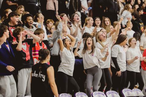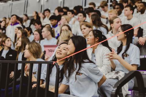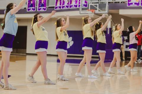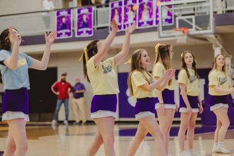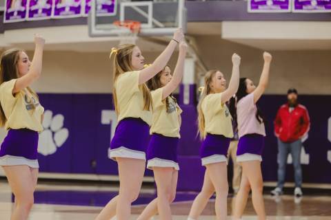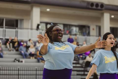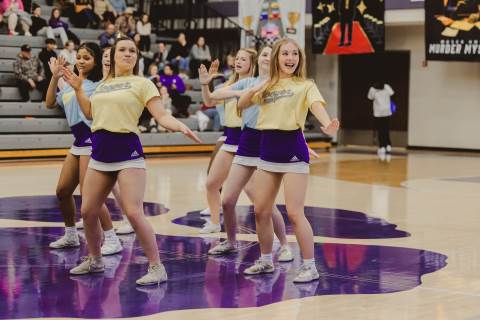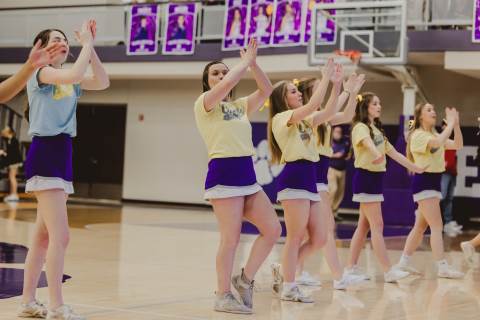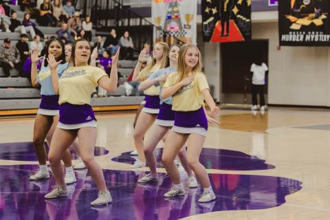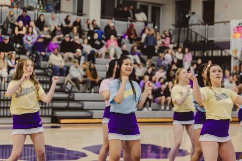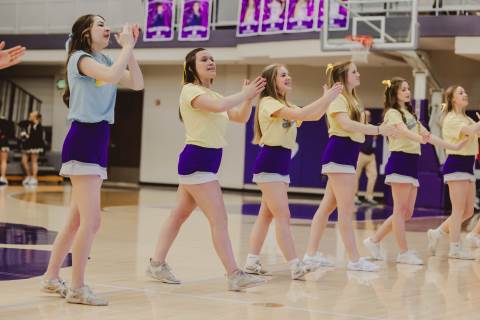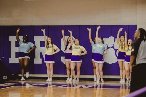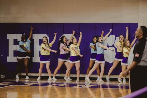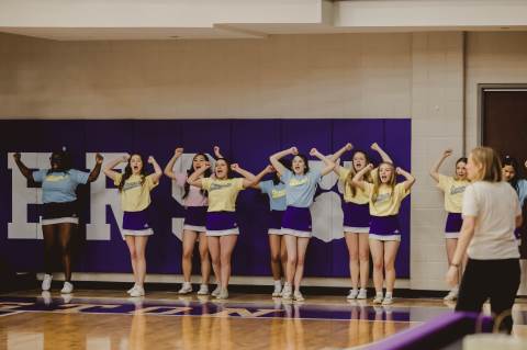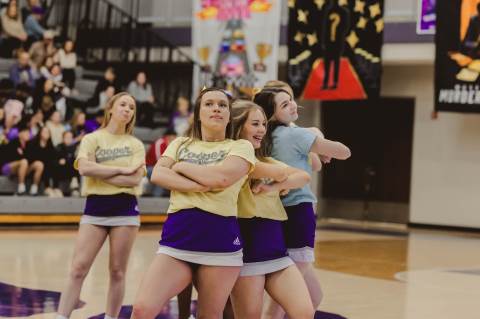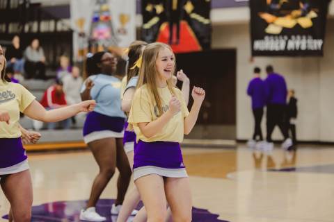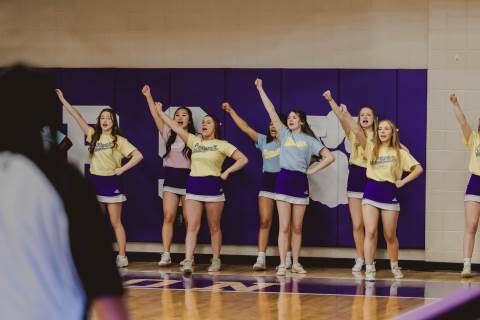 The varsity basketball cheerleading squad hypes up the crowd during RUMPUS.