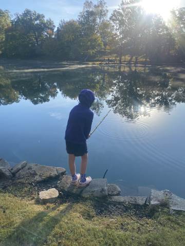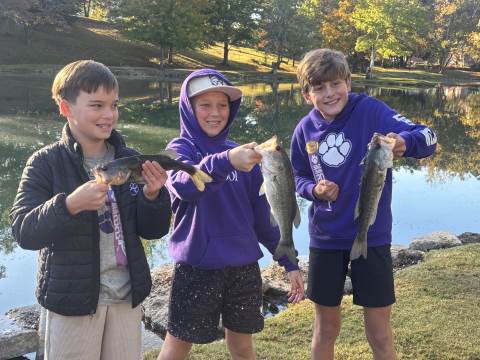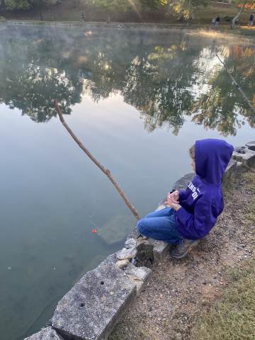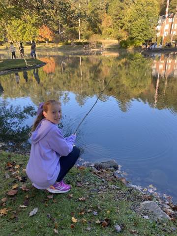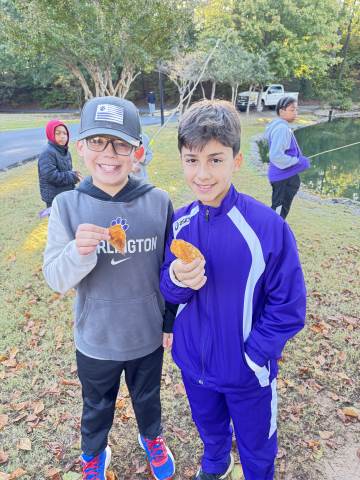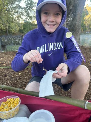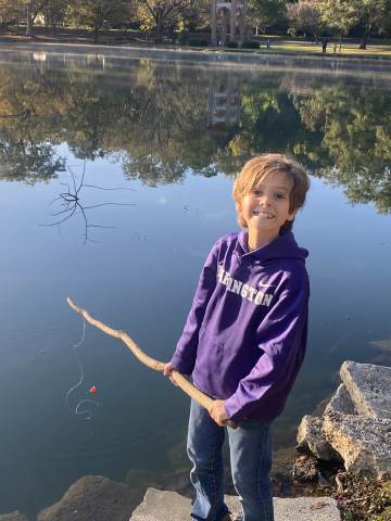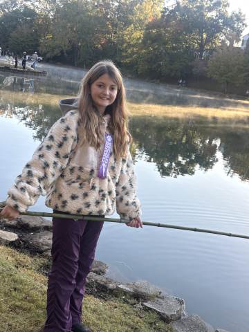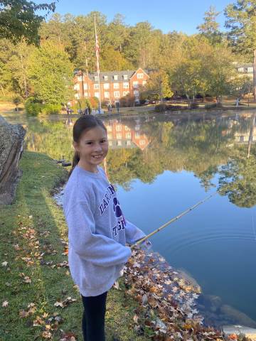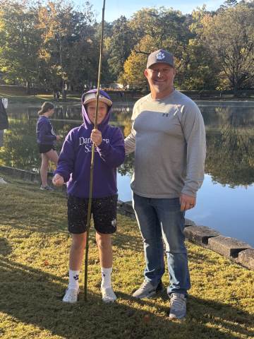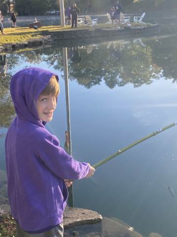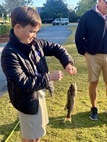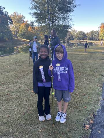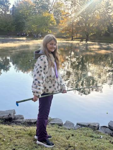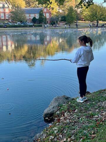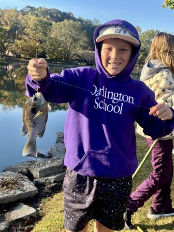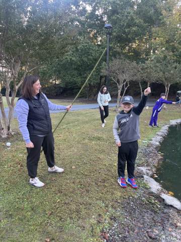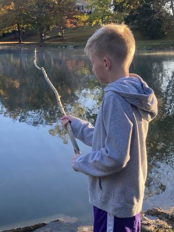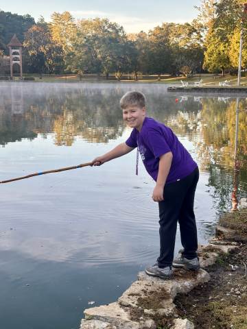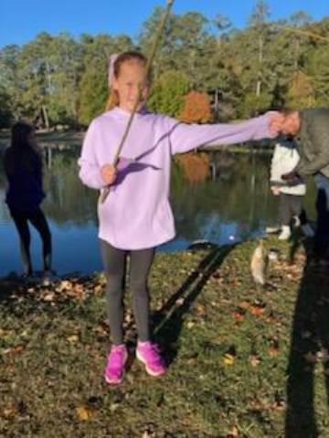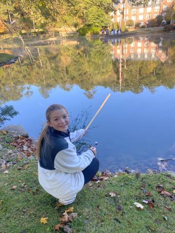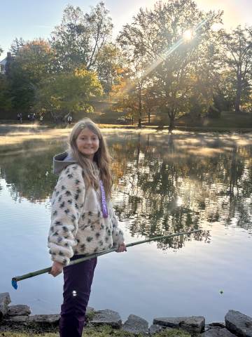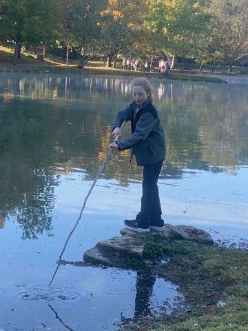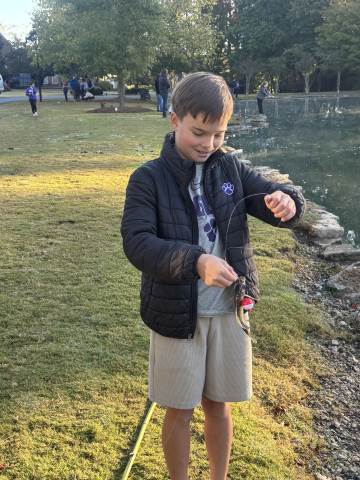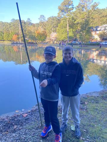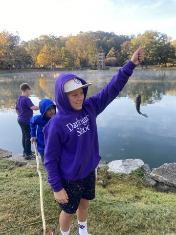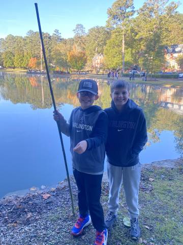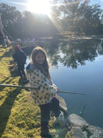 Fifth-graders read Gary Paulsen's adventure novel, "Hatchet," as their first novel in literature. The story's protagonist, Brian, must find a way to survive in the Canadian wilderness after his plane crashes. As part of our annual "Hatchet Day," students were challenged with creating their own fishing pole to catch fish in Silver Lake. This year's class caught 60+ fish!
