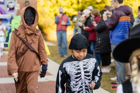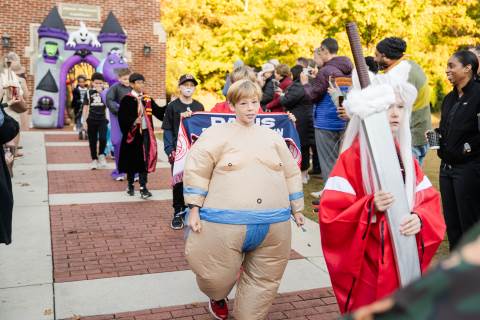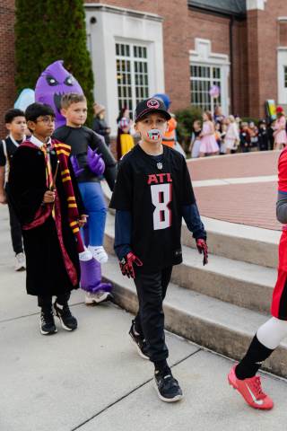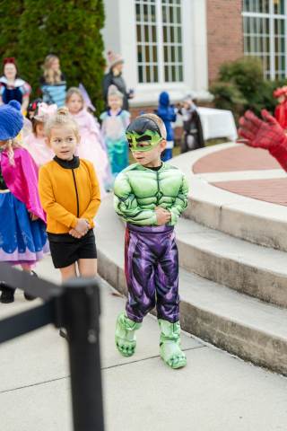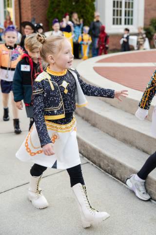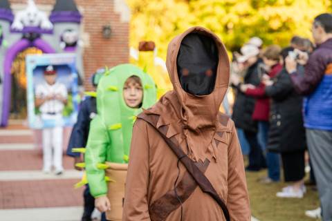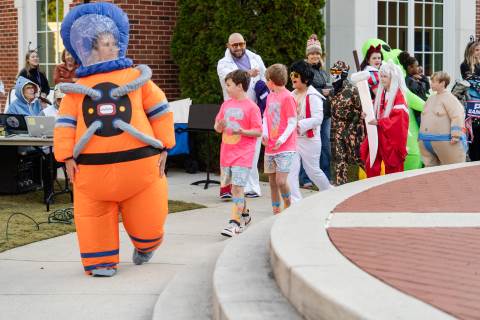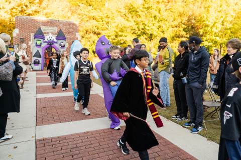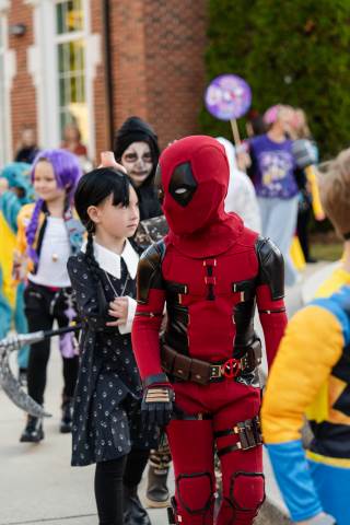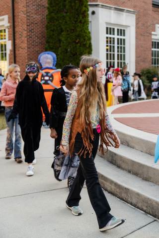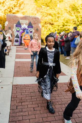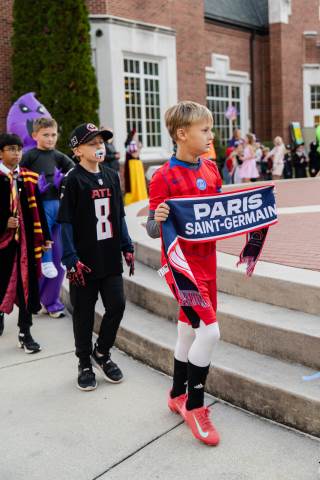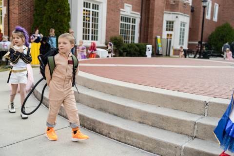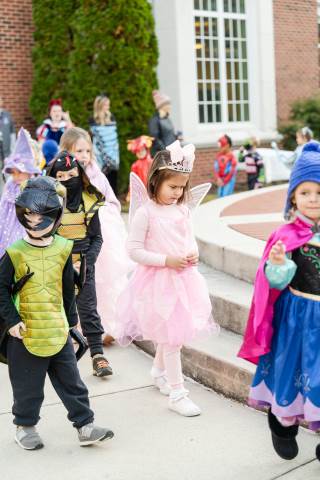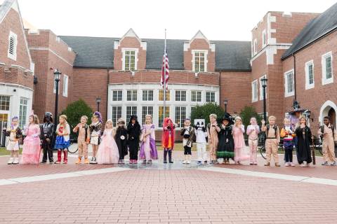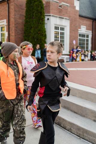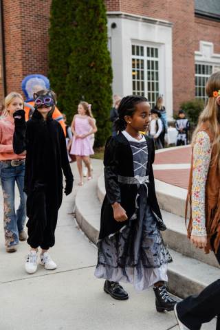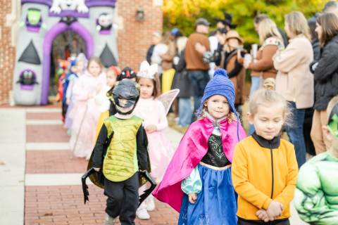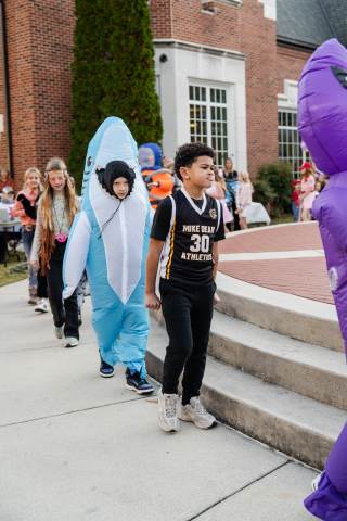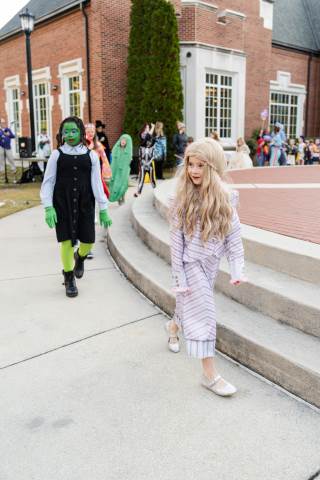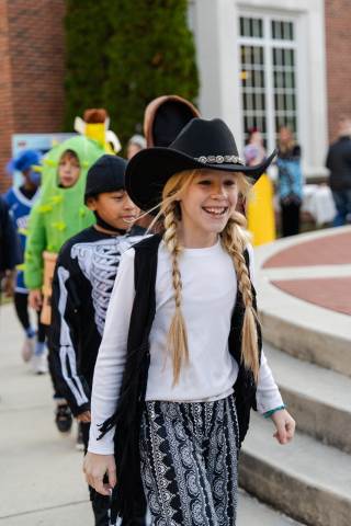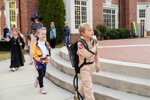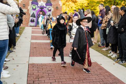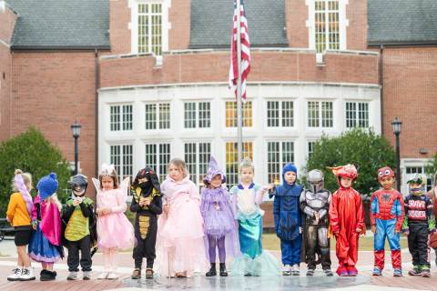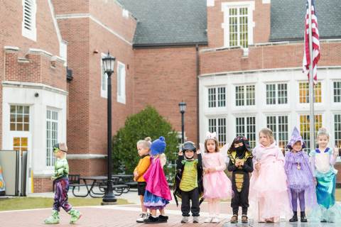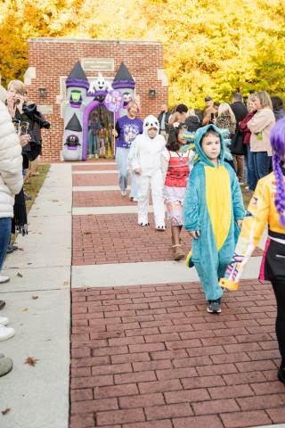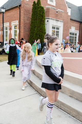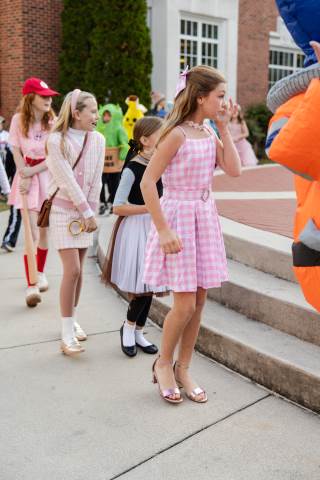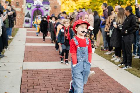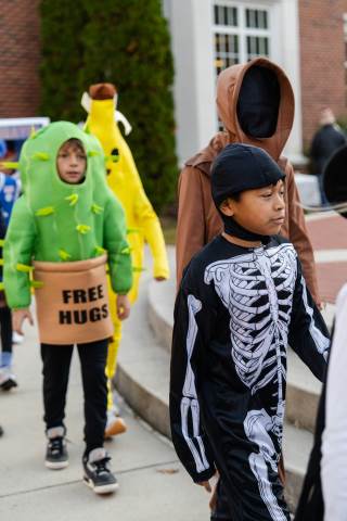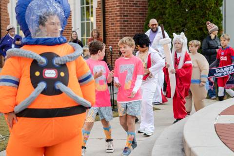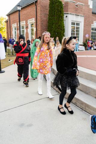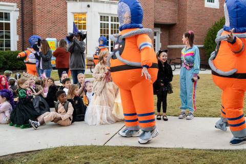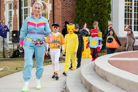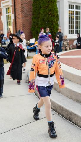 Students in grades pre-K to 5 show off their Halloween costumes at the annual parade before advisory groups representing grades 6-8 perform their skits for parents and special guests.