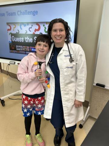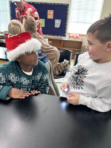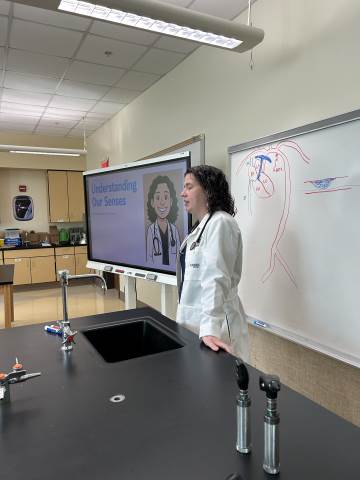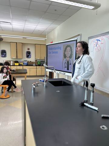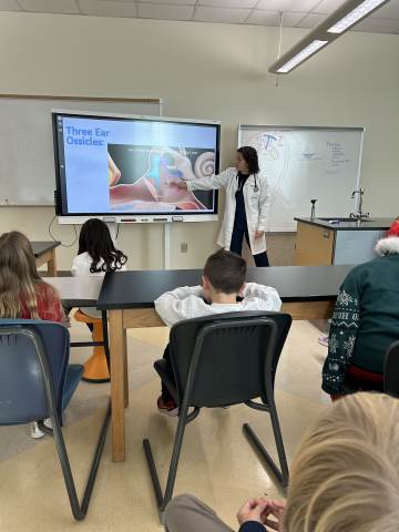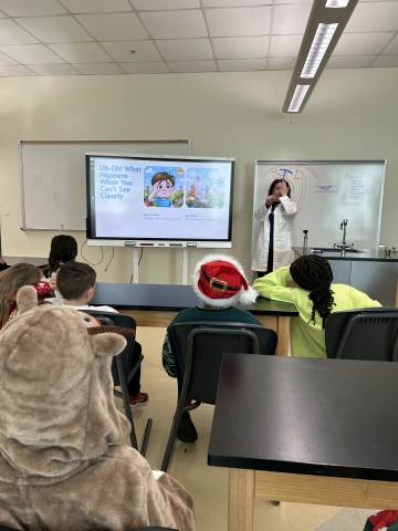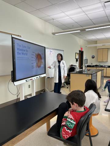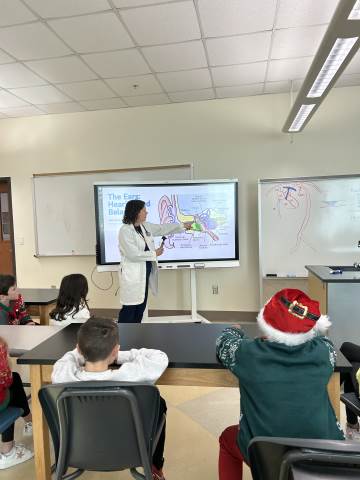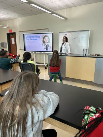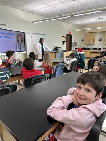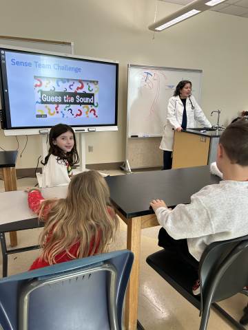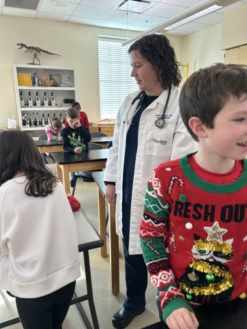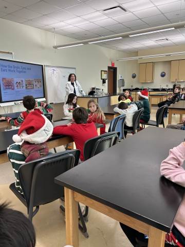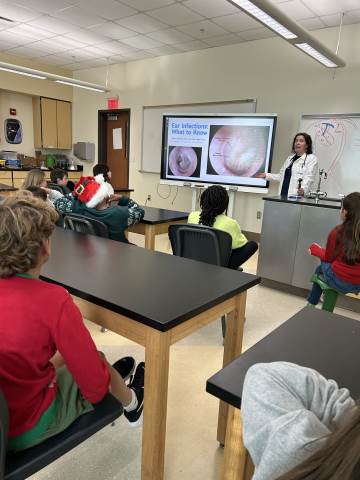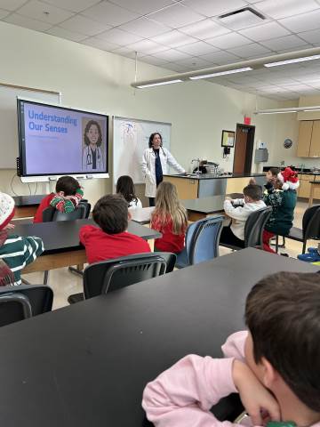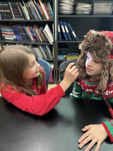 As third grade continues their study of the human body, we had the honor of a visit from Nathan's mom, Dr. Karen Eberhart, to share her work and knowledge as a family medicine practitioner with Harbin Clinic in Cedartown. She especially focused on our eyes and ears and how she works to keep her patients healthy. She brought her tools of the trade to show the kids how our eyes react when exposed to light and how she is able to see in our ears. She showed us diagrams of the inner ear and the parts of the eye and how they work.