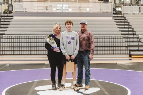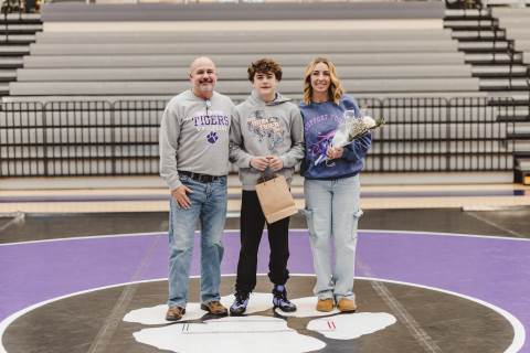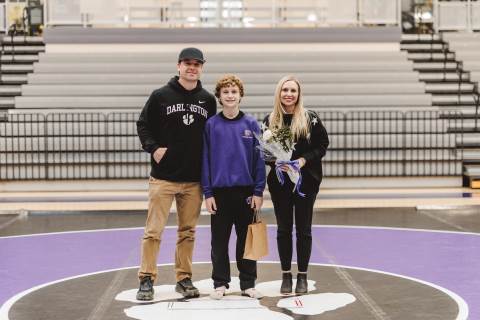 Eighth-grade members of the middle school wrestling team are honored before. the varsity meet.