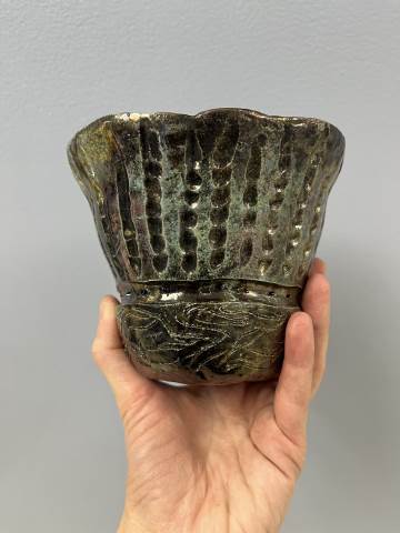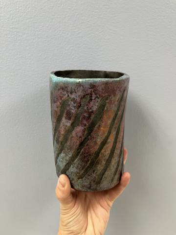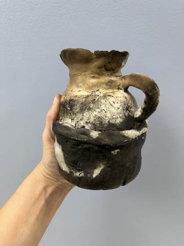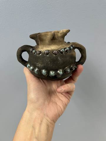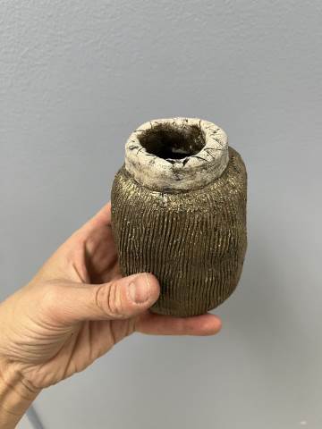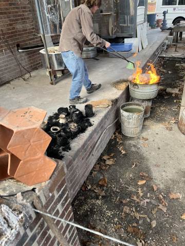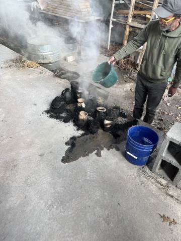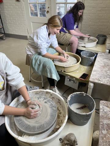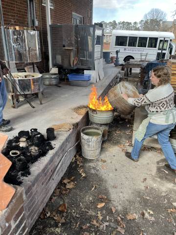 Students from 8th period Art 1 took a field trip to Berry College to participate in a Raku Firing. Raku involves quickly firing the ceramic pieces in a kiln, removing the objects when they are red hot, and placing them in metal containers of combustible materials to create unique smoke and metallic effects through reduction. While the students waited for the second firing to reach temperature, they were able to try out the pottery wheels. Their finished pieces came out with a range of interesting surfaces which complimented the historical pottery forms they referenced when making the hand-built vessels!