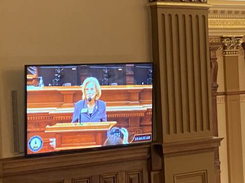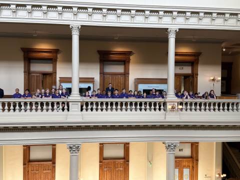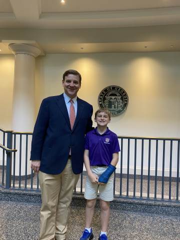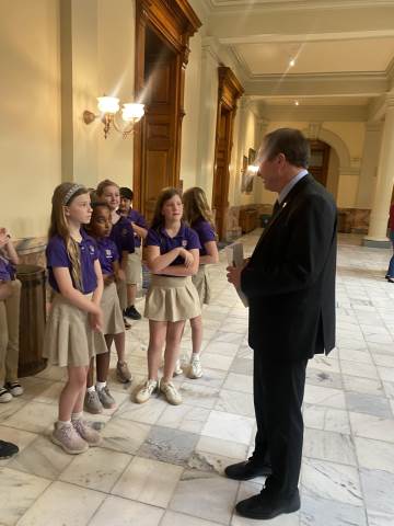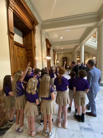 Throughout the visit, students had the opportunity to meet State Rep. Matt Barton, State Rep. Stacey Evans and State Sen. Chuck Huffstetler. They also spotted former Georgia Attorney General Sam Olens and former State Sen. Jeff Mullis. Before leaving, our class of purple shirts was spotted by Gretchen Corbin, president and CEO of the Georgia Lottery Corp. A highlight of the day was taking a group photo with Gov. Brian Kemp and First Lady Marty Kemp, making the experience even more memorable.