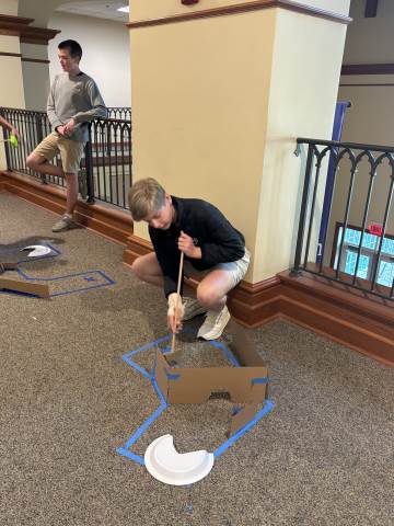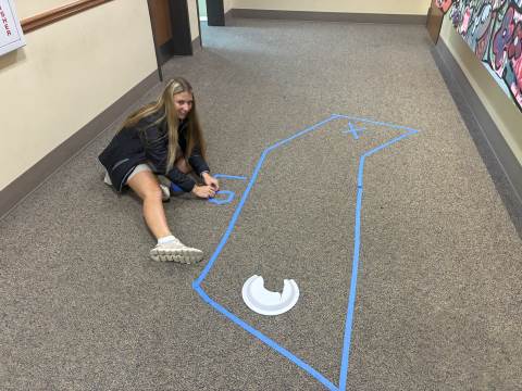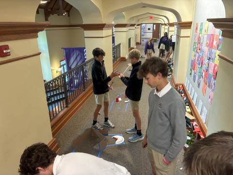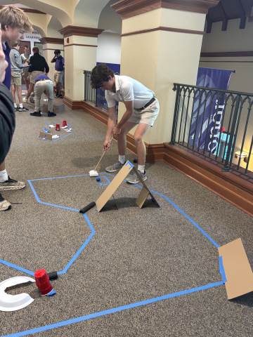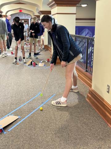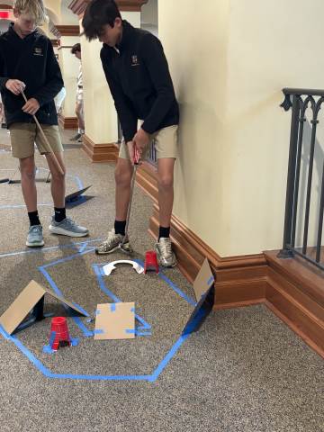 Students in Mr. Eberhart’s eighth-grade Algebra 1 Honors class utilized their piecewise function skills to design miniature golf courses. Initially, they created their courses using a graphing program. Subsequently, they had the opportunity to construct and play with their courses alongside their peers.