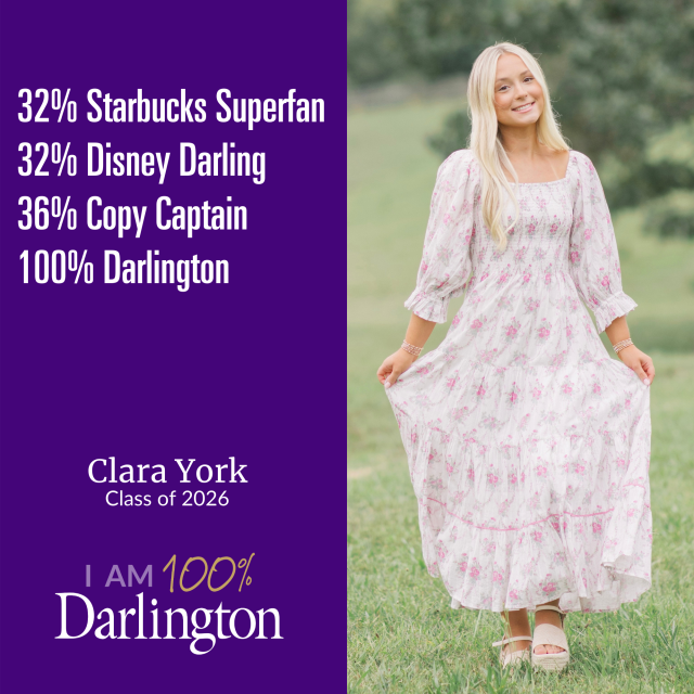 Find out how you can be 100% Darlington, too, by requesting a personal campus tour at www.darlingtonschool.org/visit or contacting admission@darlingtonschool.org.
