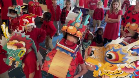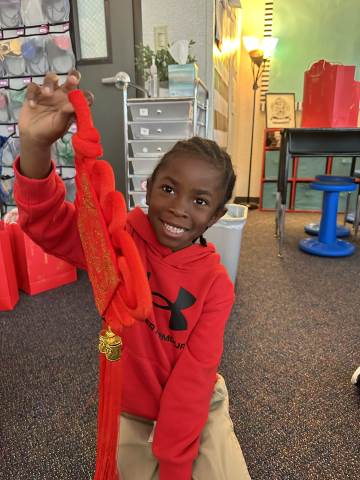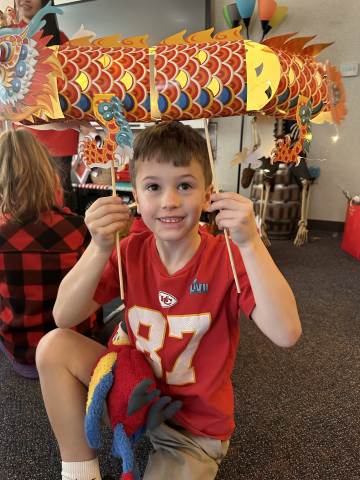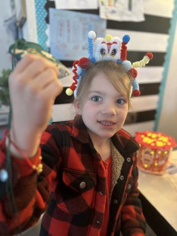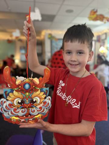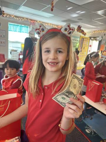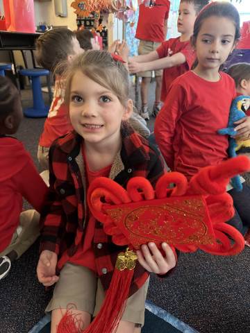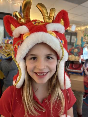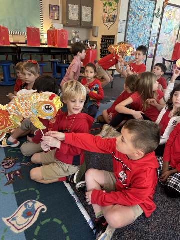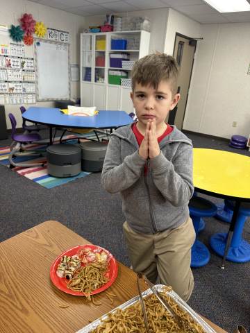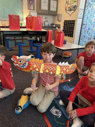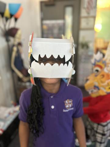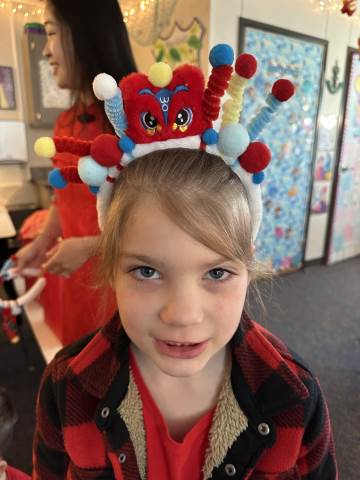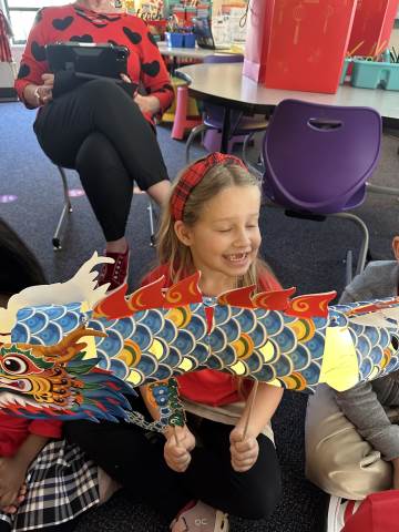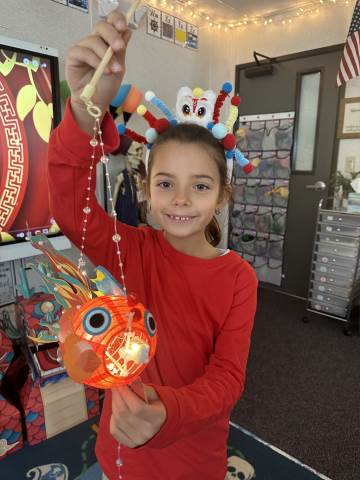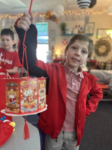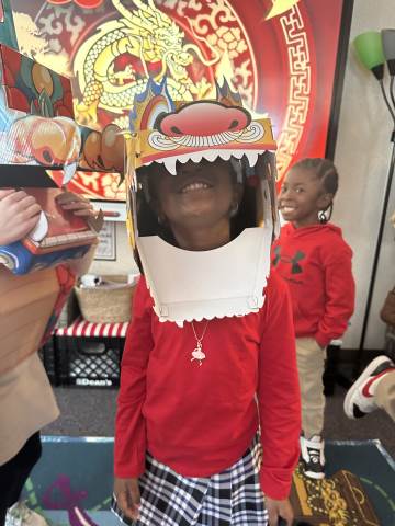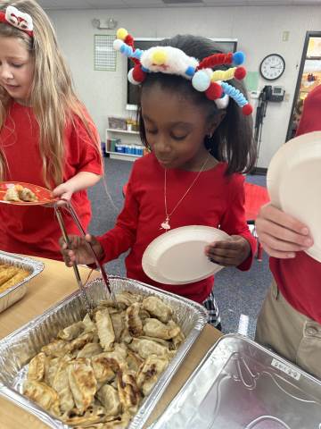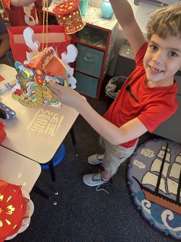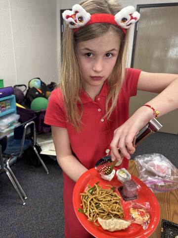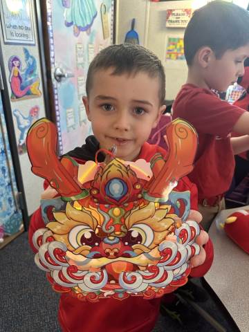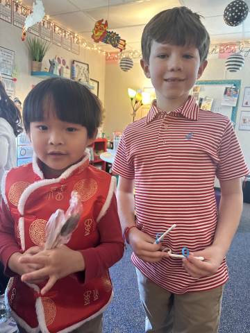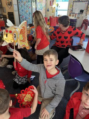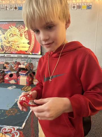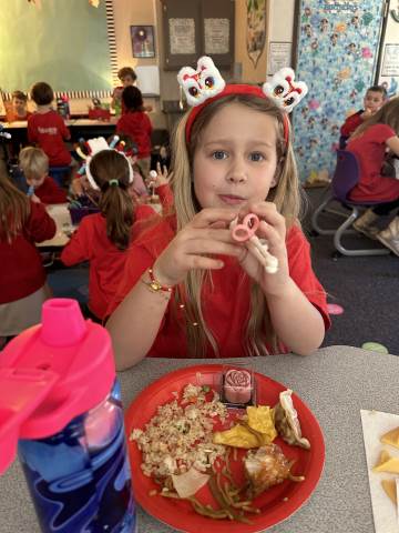 First-graders, with the help of Austin’s mom, Cloris, began celebrating the Chinese New Year today. We learned about the history of the holiday, Chinese traditions and enjoyed some delicious food. Students enjoyed looking at traditional Chinese lanterns, using their own chopsticks and wearing dragon masks while dancing to traditional Chinese music for the Year of the Dragon.