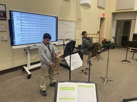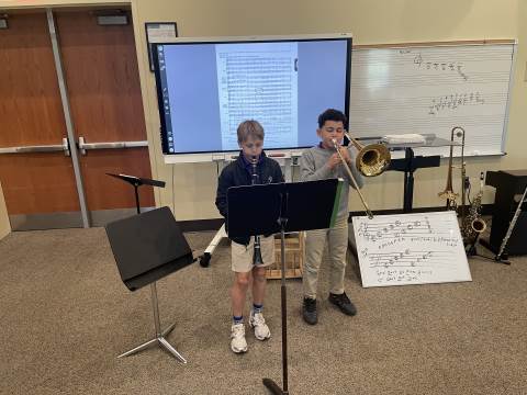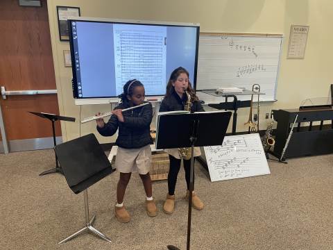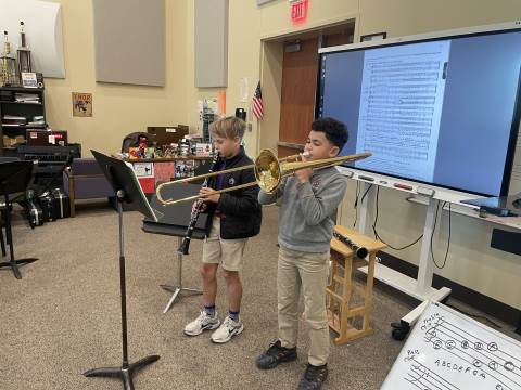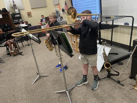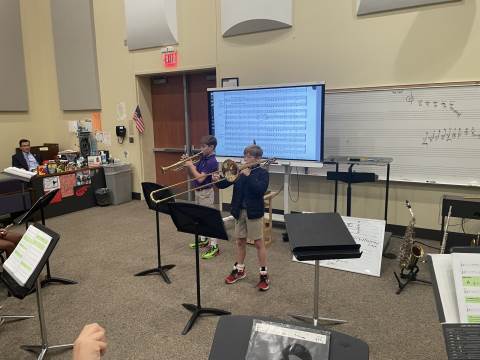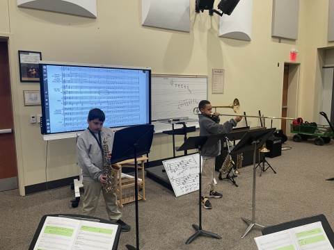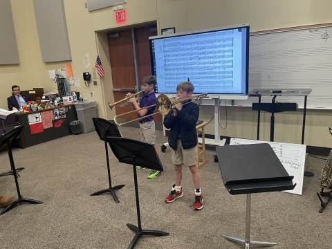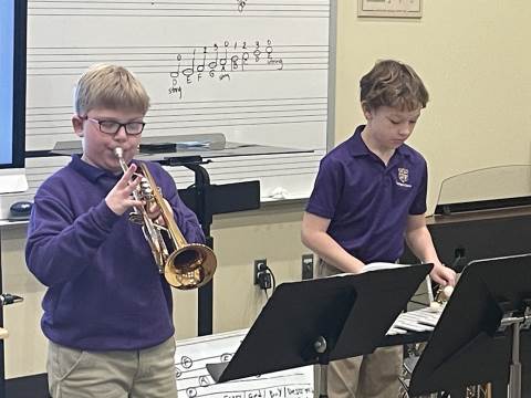 The 4th Grade Band has really enjoyed our winter season. During this time, the group has been able to "spread-out" and cover their first five notes more thoroughly. We have studied melodies that move by scale and others that move by leap. Every member of this young band has done a nice job taking responsibility for their own musicianship. Band members often play by themselves for the class, and they recently had their first experience playing duets. Each pair performed two-part harmony, with both players having a chance to perform both parts. This band is the newest addition to our Darlington band program, and they are off to a very successful start. We look forward to hearing many great sounds from these Talented Tigers!