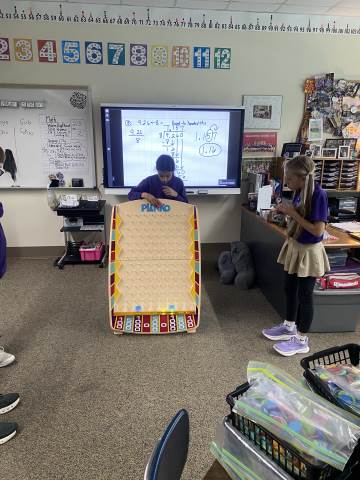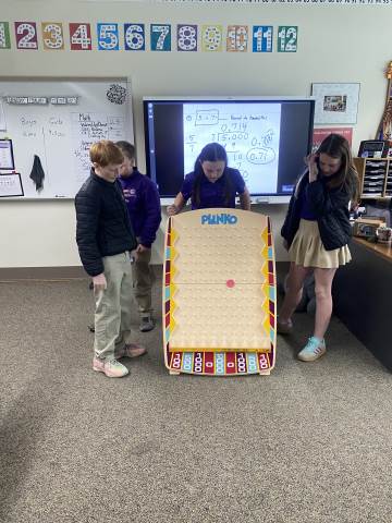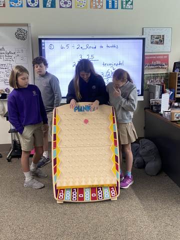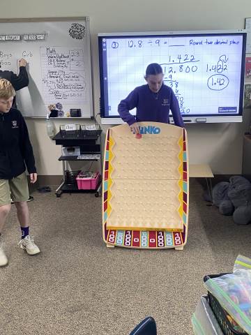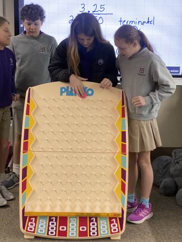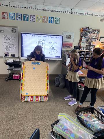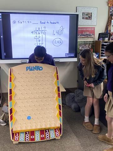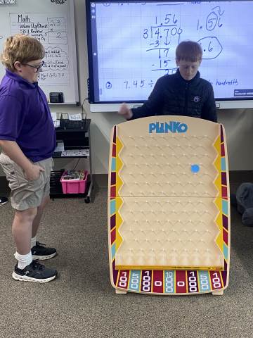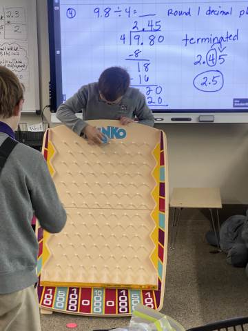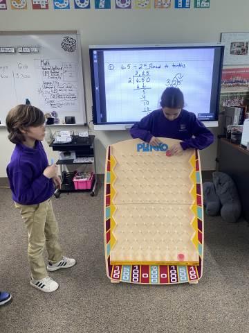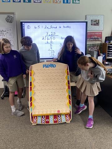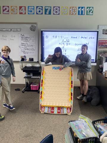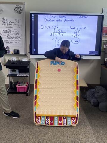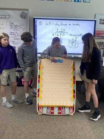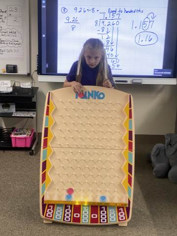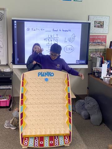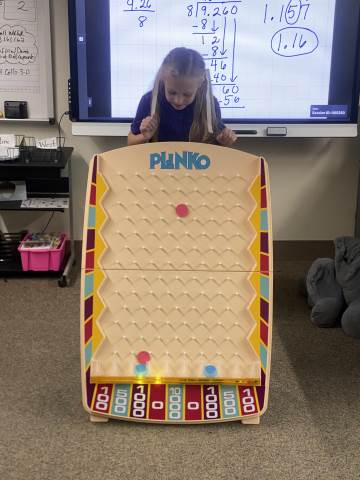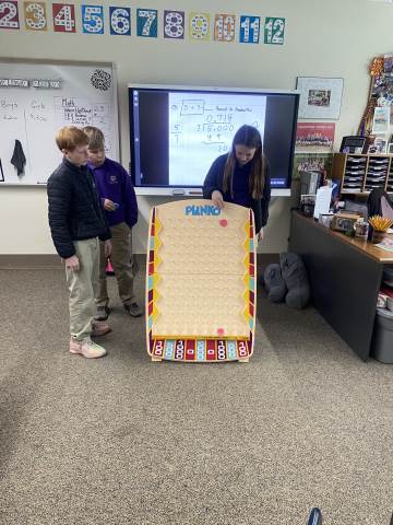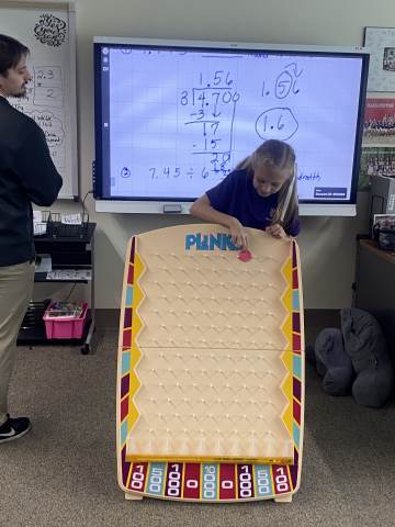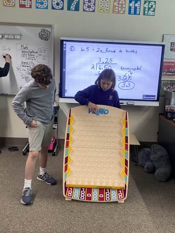Fifth-graders had fun practicing the skill of dividing with decimal by playing the Price is Right game Plinko.