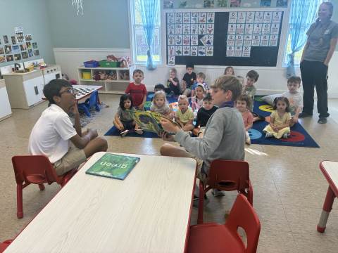 Our eighth-grade Capstone students recently visited Wiggles and Giggles Childcare Center, where they spent time reading to young children, playing with them, and helping out in different classrooms. It was especially rewarding to watch the students grow more comfortable throughout the visit. What started as a group of tentative and shy middle schoolers quickly turned into enthusiastic mentors, sitting on the floor, engaging with the little ones, and fully immersing themselves in the experience. By the end of the day, many of them didn’t want to leave, a true testament to the meaningful connections they built.
